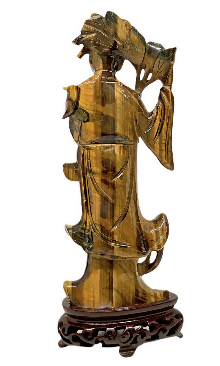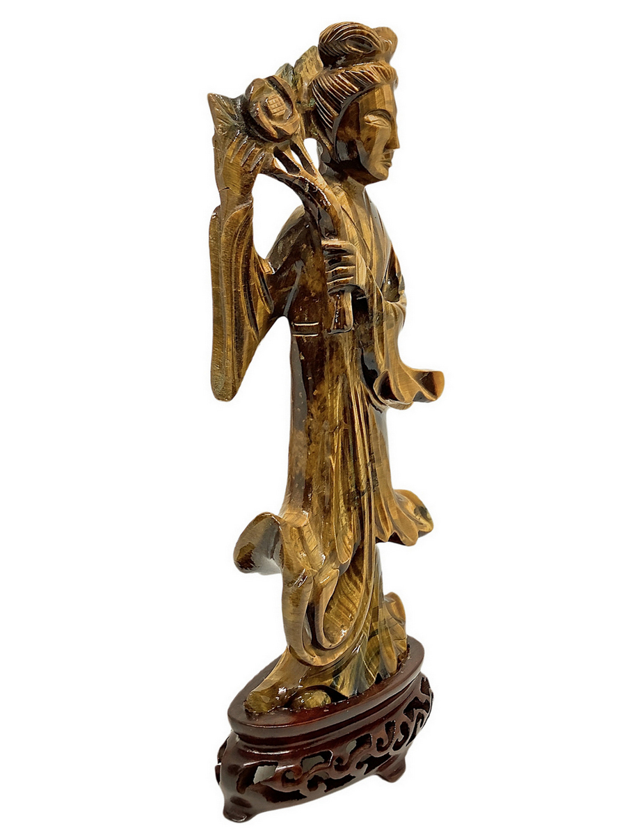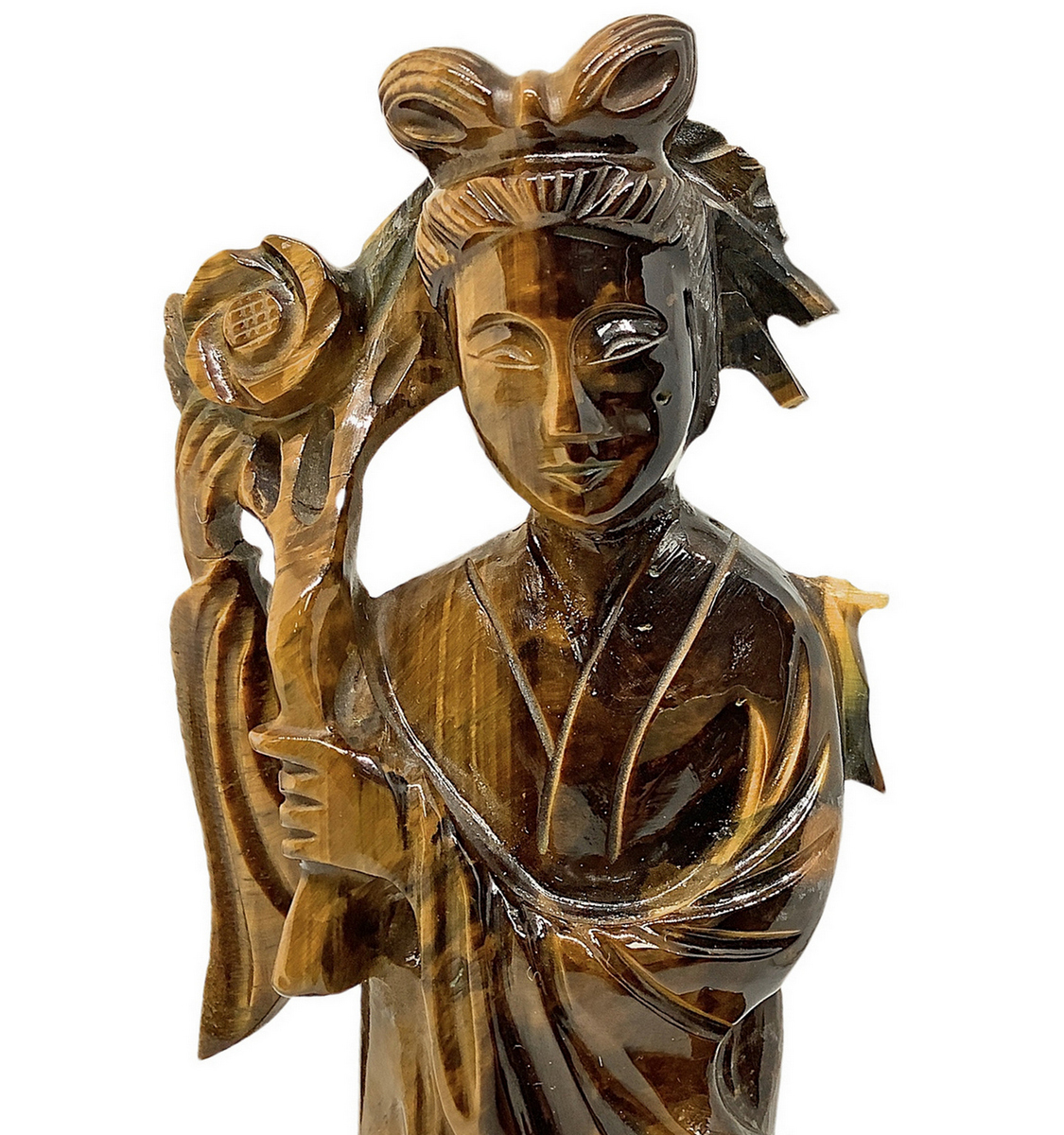 Statuetta raffigurante Guanin in occhio di tigre. H complessiva cm 18, larghezza cm 7