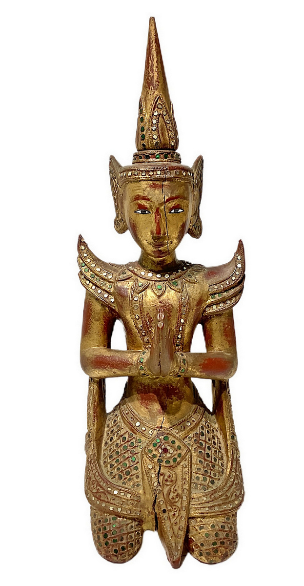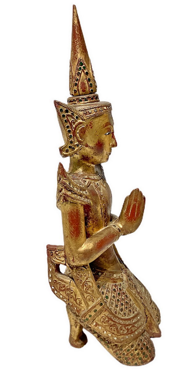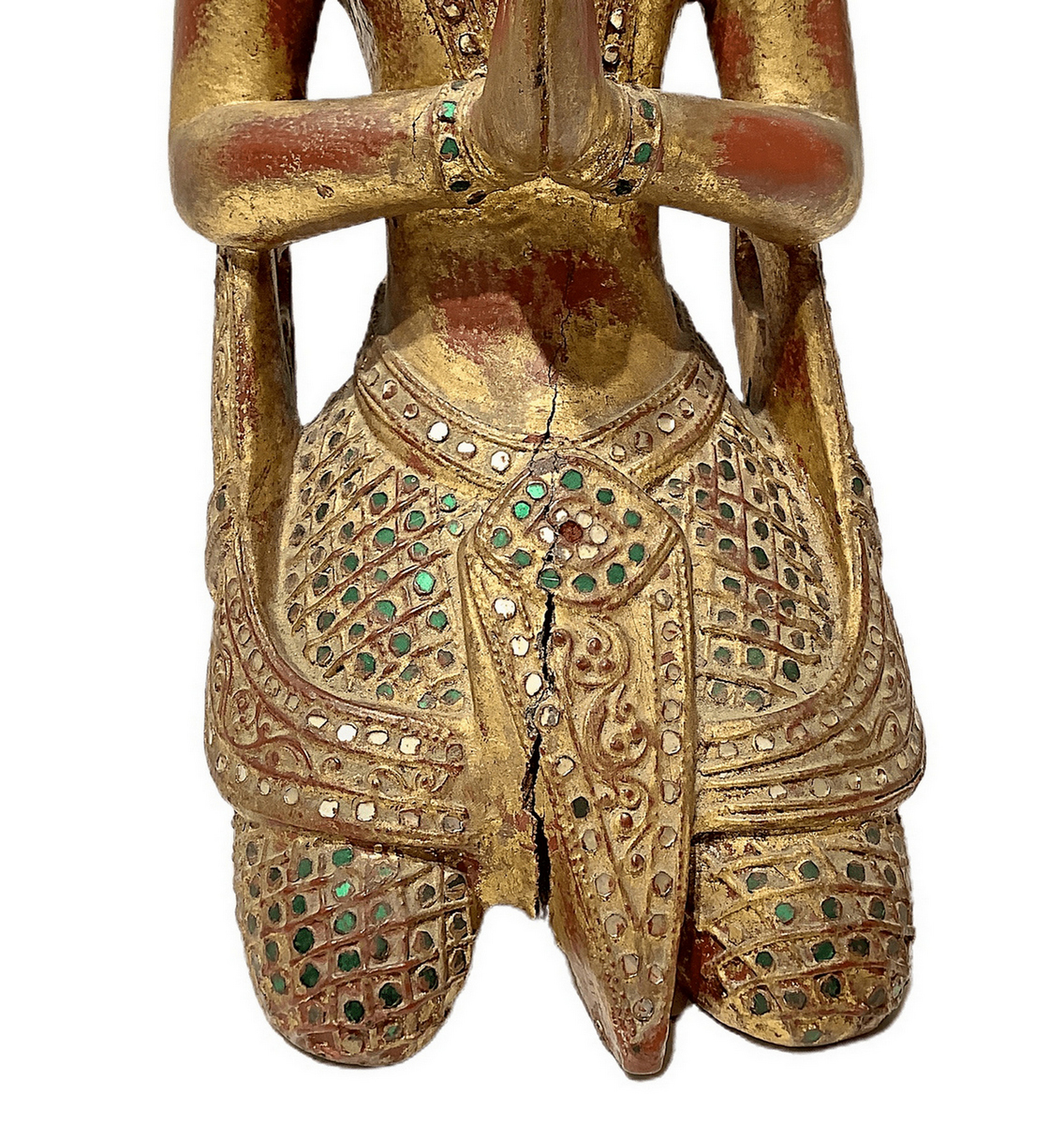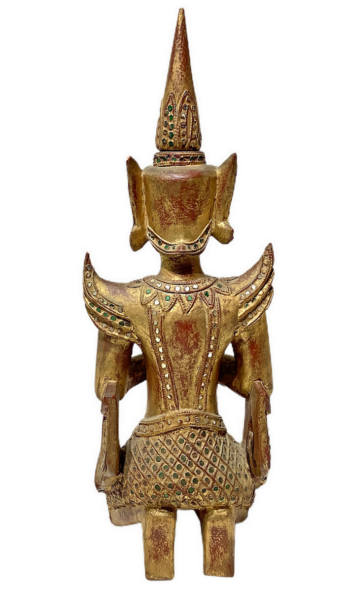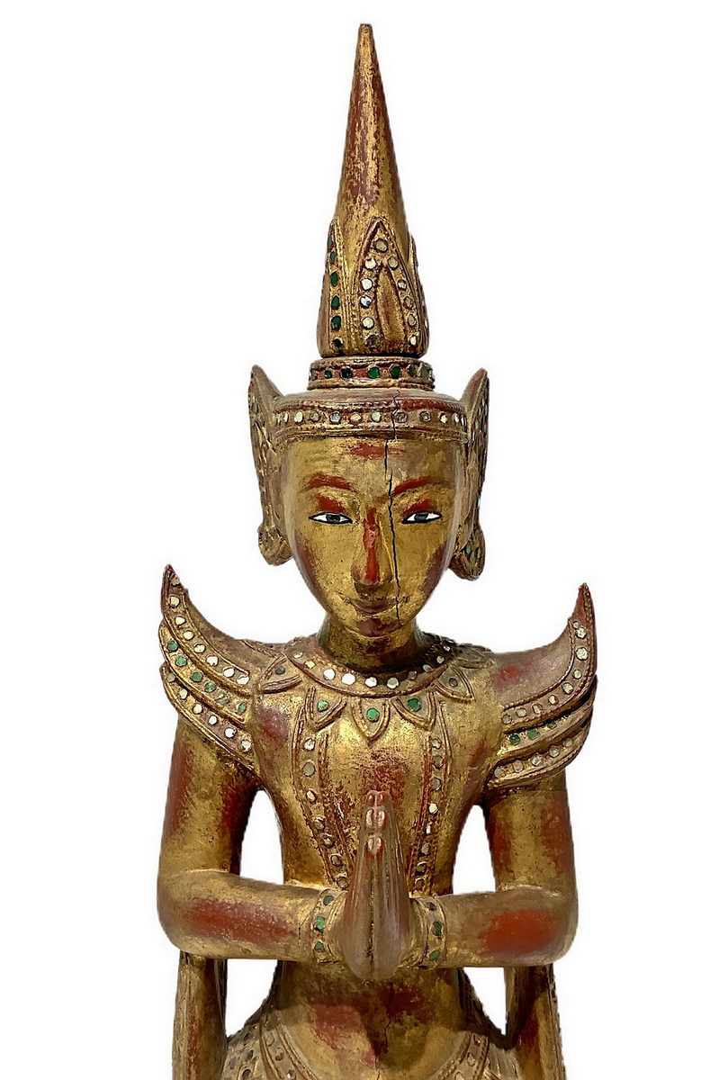 Scultura lignea, divinità orientale, inizi XX secolo. In legno dorato con applicazioni di vetri colorati. H cm 51