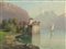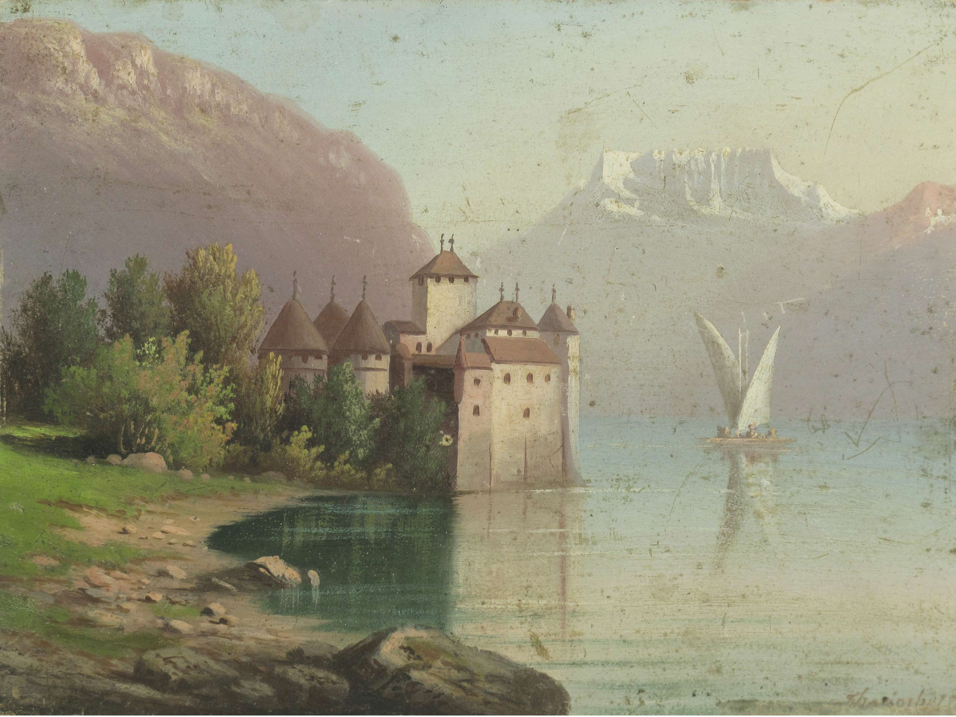Firma illeggibile (XIX secolo) Castello svizzero Olio su tavola Firmato Misure 14.2x19.1 cm