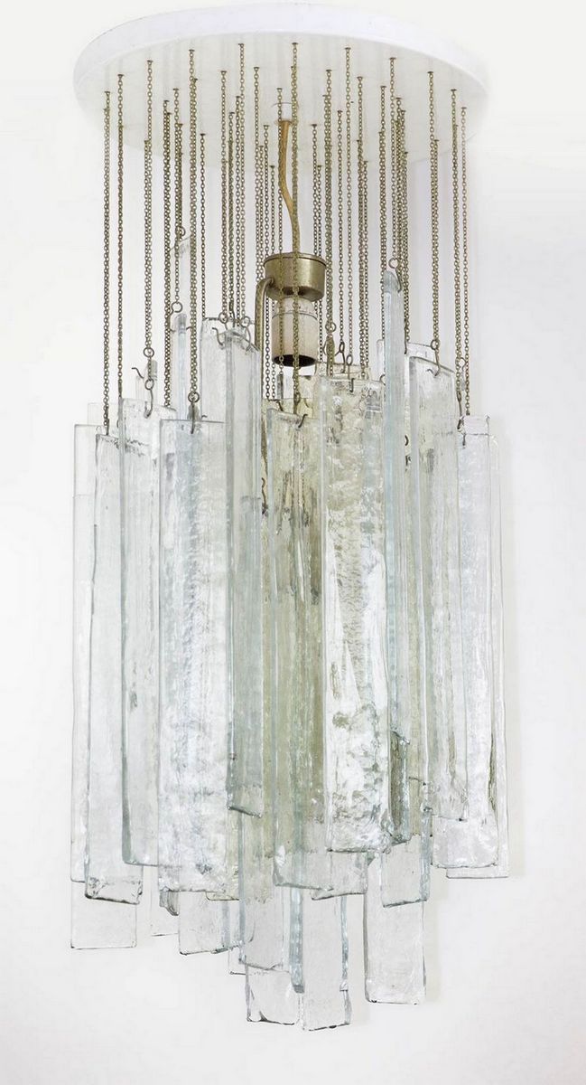 Mazzega, lampadario in vetro e catena ottone, anni '60. Larghezza coppa rotonda, diametro cm 40, h max cm 90.