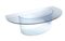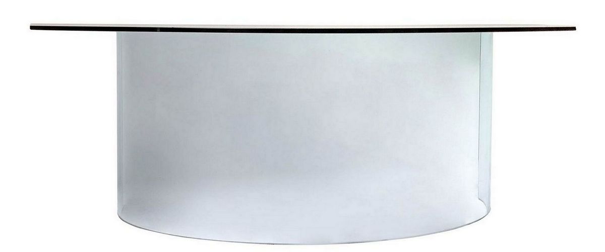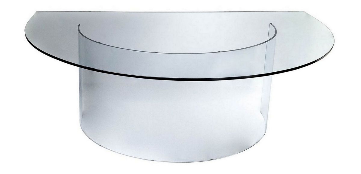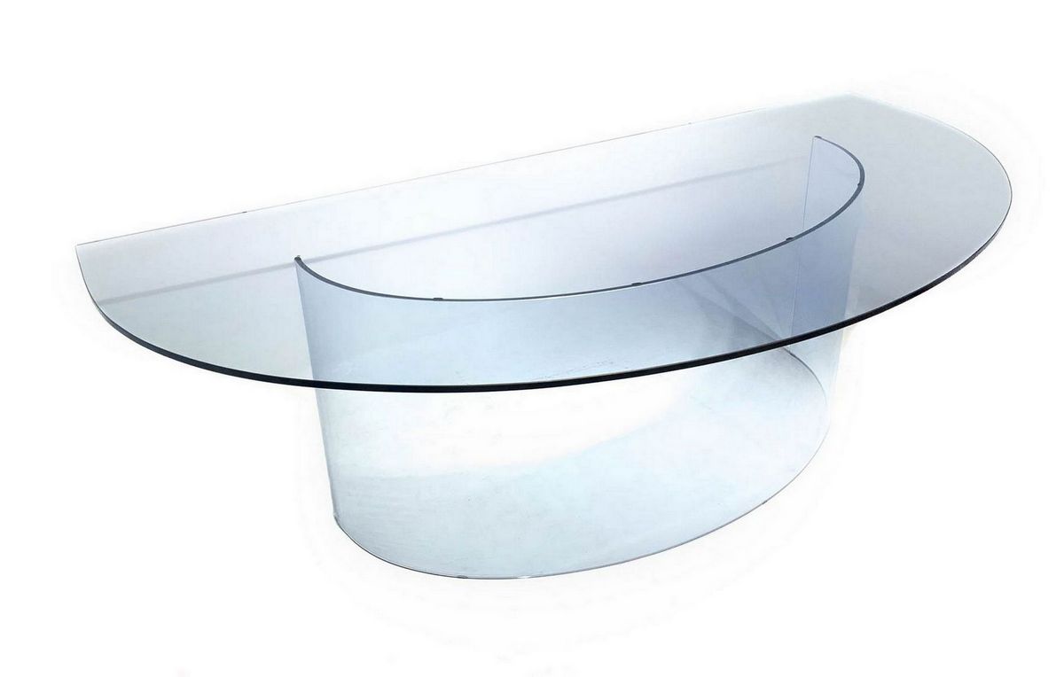 Fiam, scrivania in vetro con piano a demilune, piede formato da una lastra di vetro curvato di forte spessore. Anni '80. H cm 72x230x112.