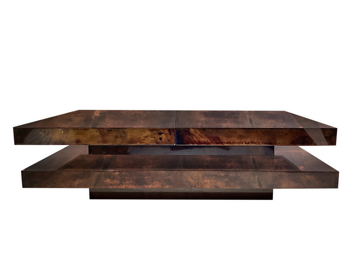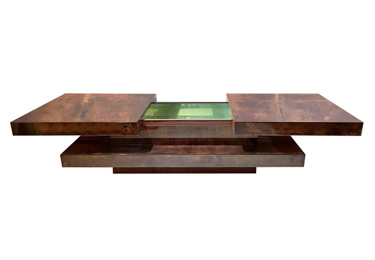 Prod.Aldo Tura, tavolo da caffè con struttura in legno rivestimento in pergamena acrilicata nei toni del marrone, vano bar a scomparsa rivestito in specchio. Segni d’uso. Cm 140 x 80 x 35