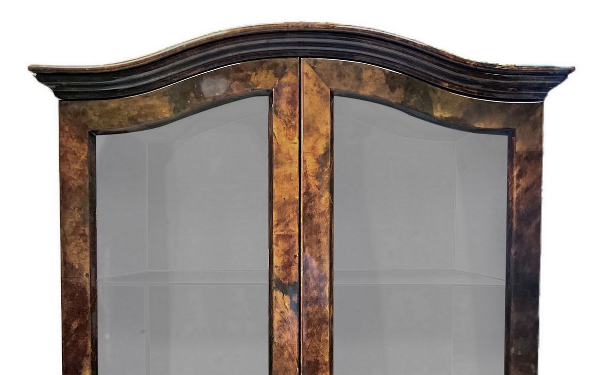 Prod.Aldo Tura, Vetrina a giorno con struttura in legno rivestimento in pergamena acrilicata nei toni del marrone, inter