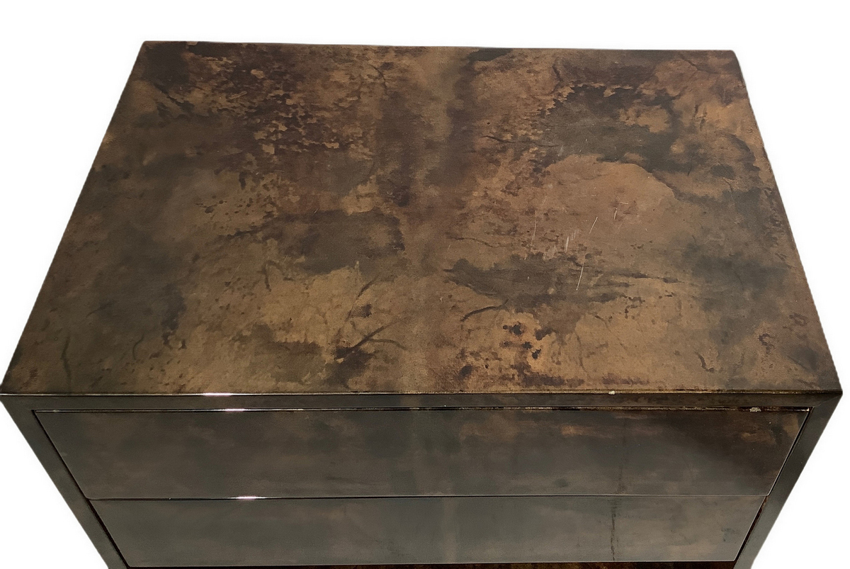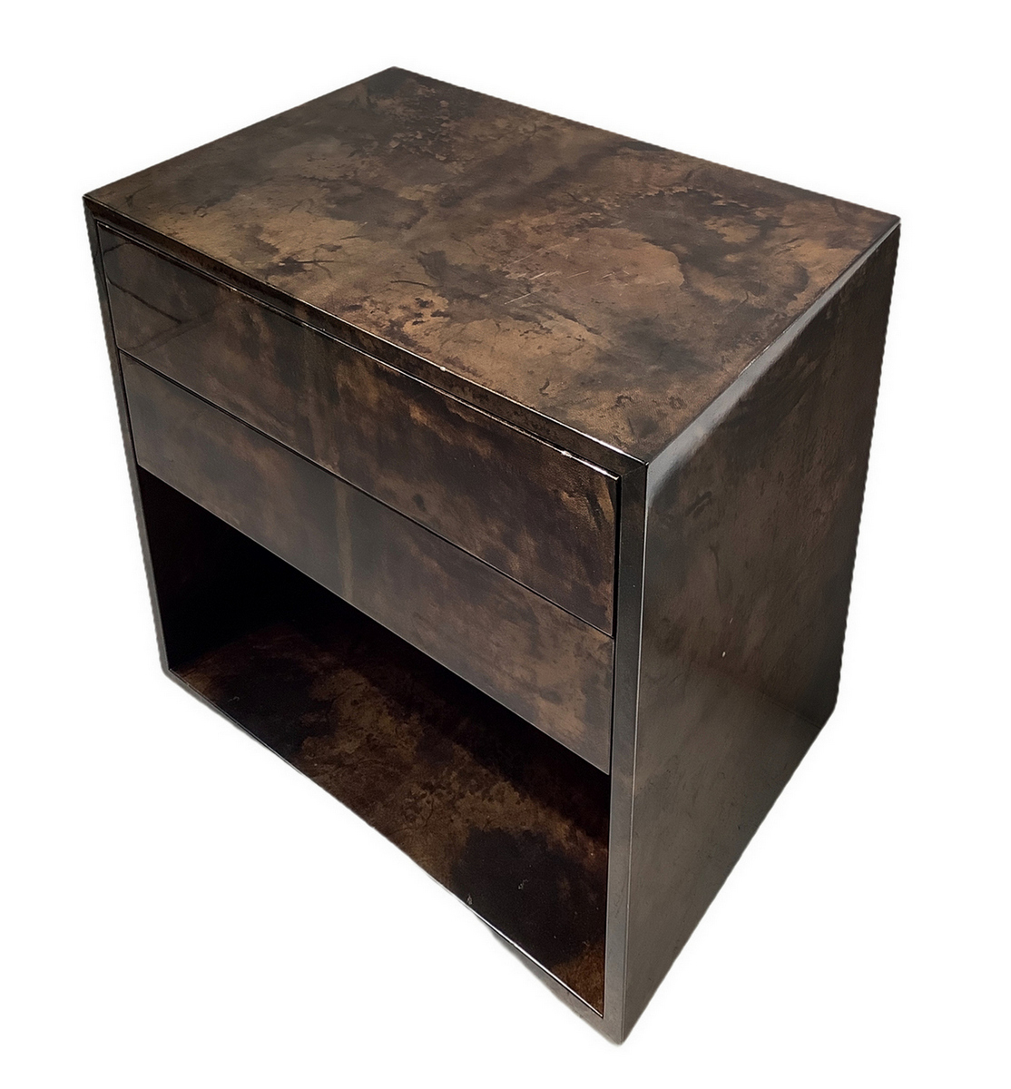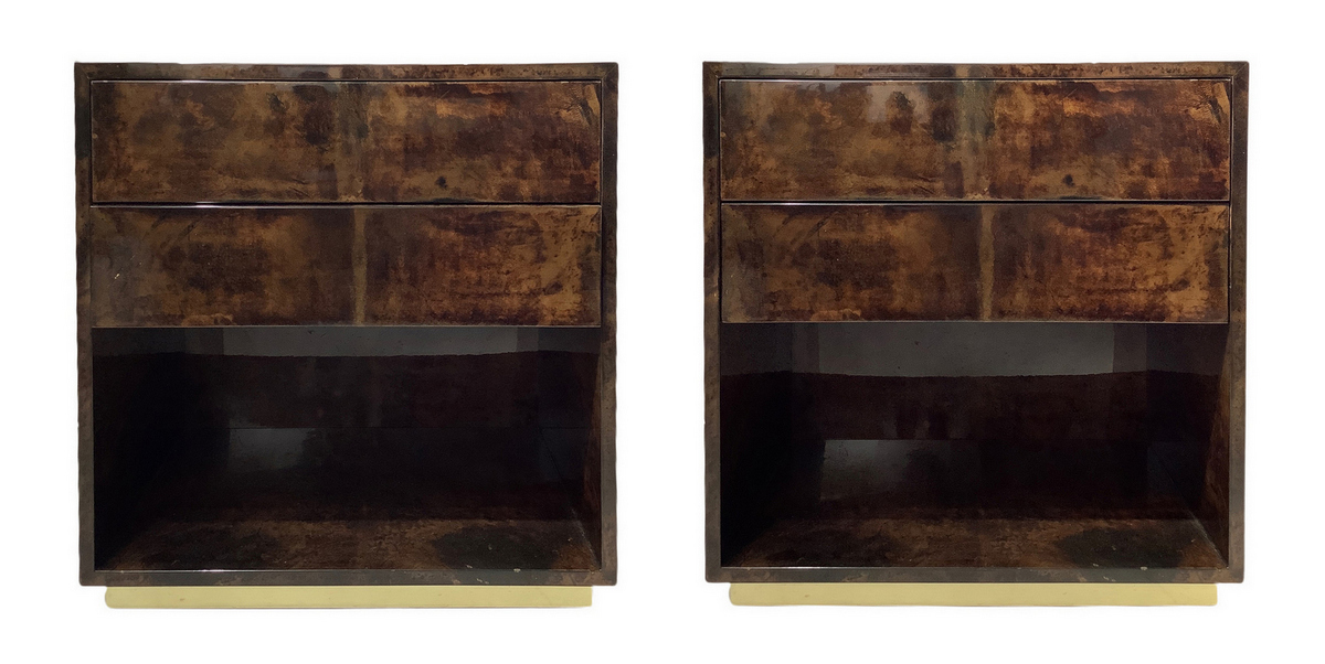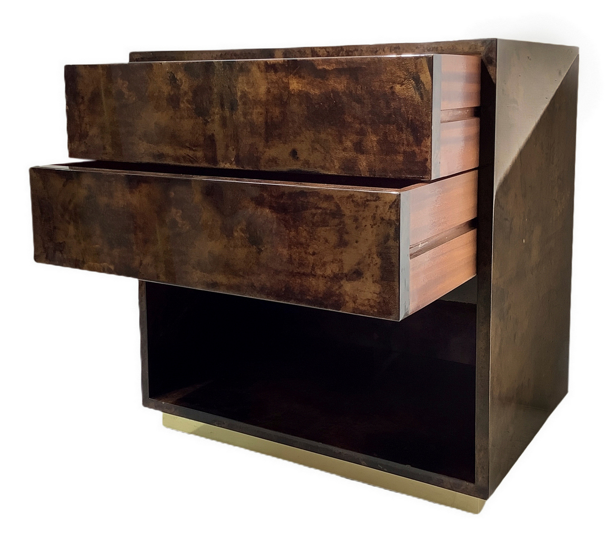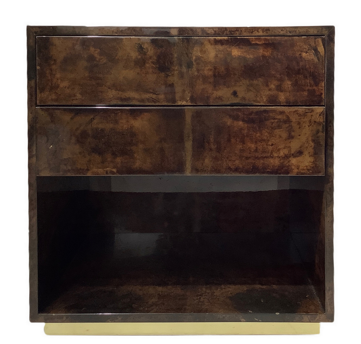Prod.Aldo Tura, coppia comodini con struttura in legno, rivestimento in pergamena acrilicata nei toni del marrone e cassetti con apertura a pressione. Segni d’uso. H cm 70, P cm 45, L cm 65