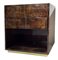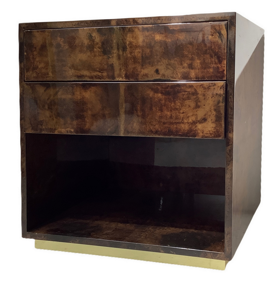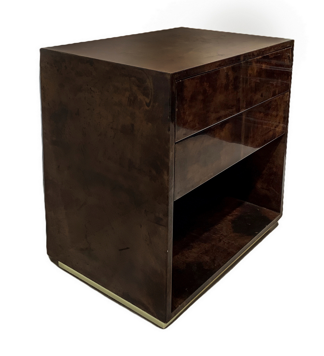Prod.Aldo Tura, coppia comodini con struttura in legno, rivestimento in pergamena acrilicata nei toni del marrone e cass
