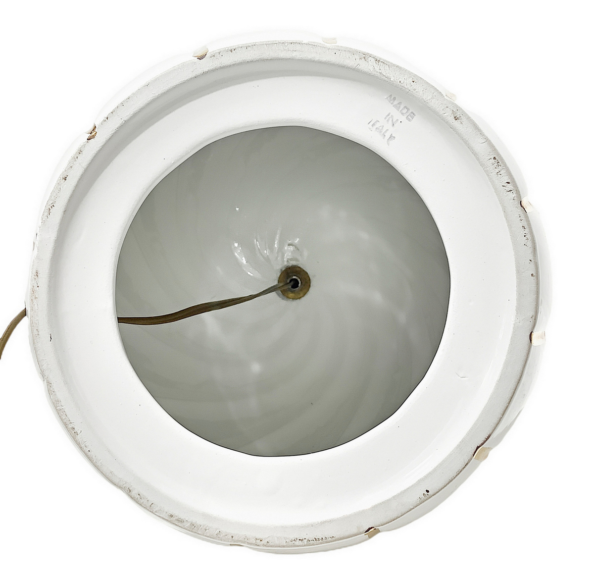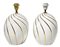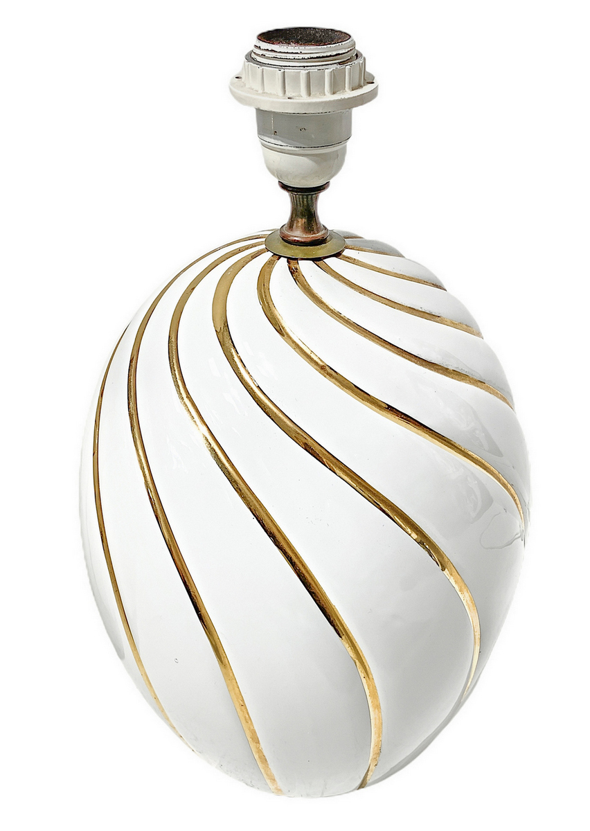 Coppia di lampade in porcellana bianca, prod italiana. Superfice riportante dettagli in oro. Anni ‘70. H cm 39. Diametro cm 22