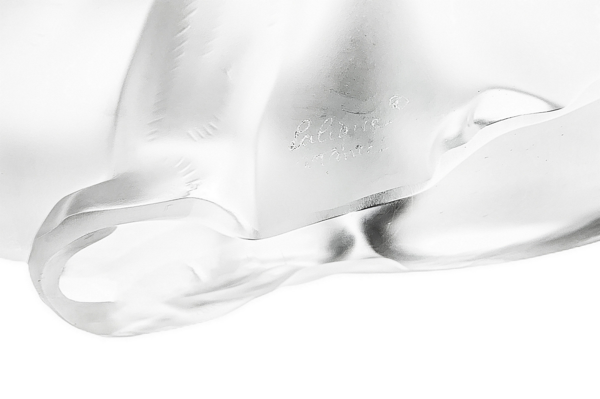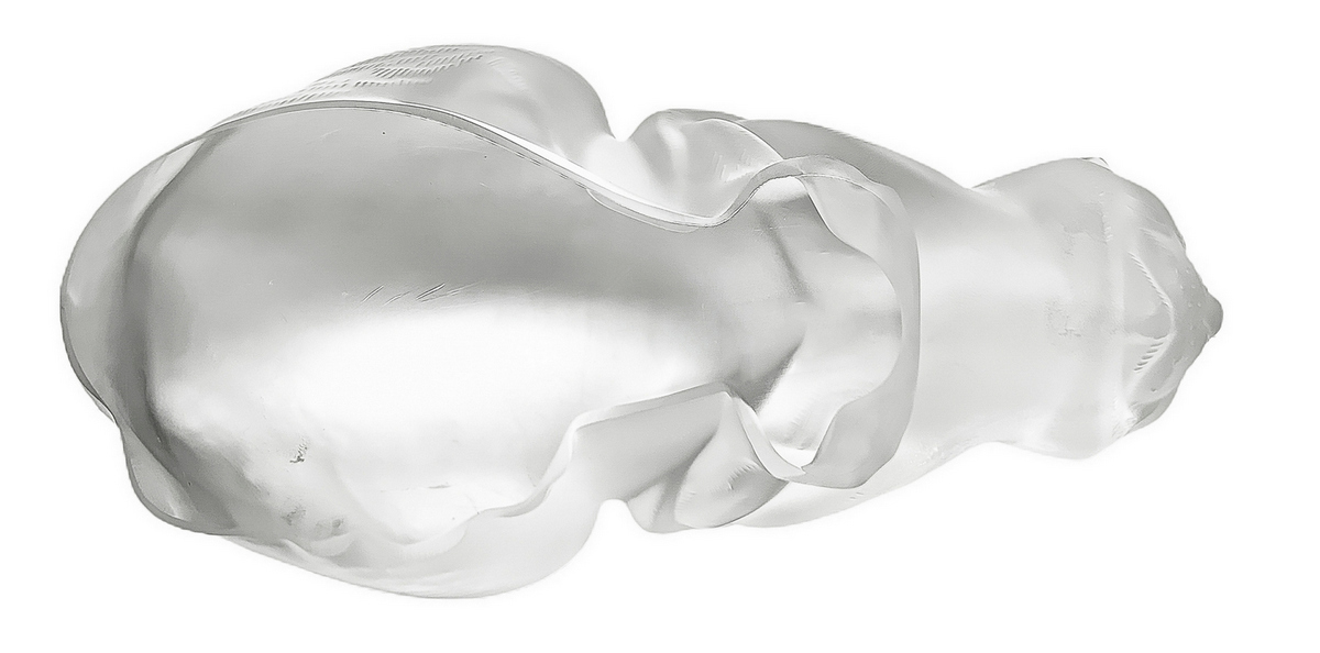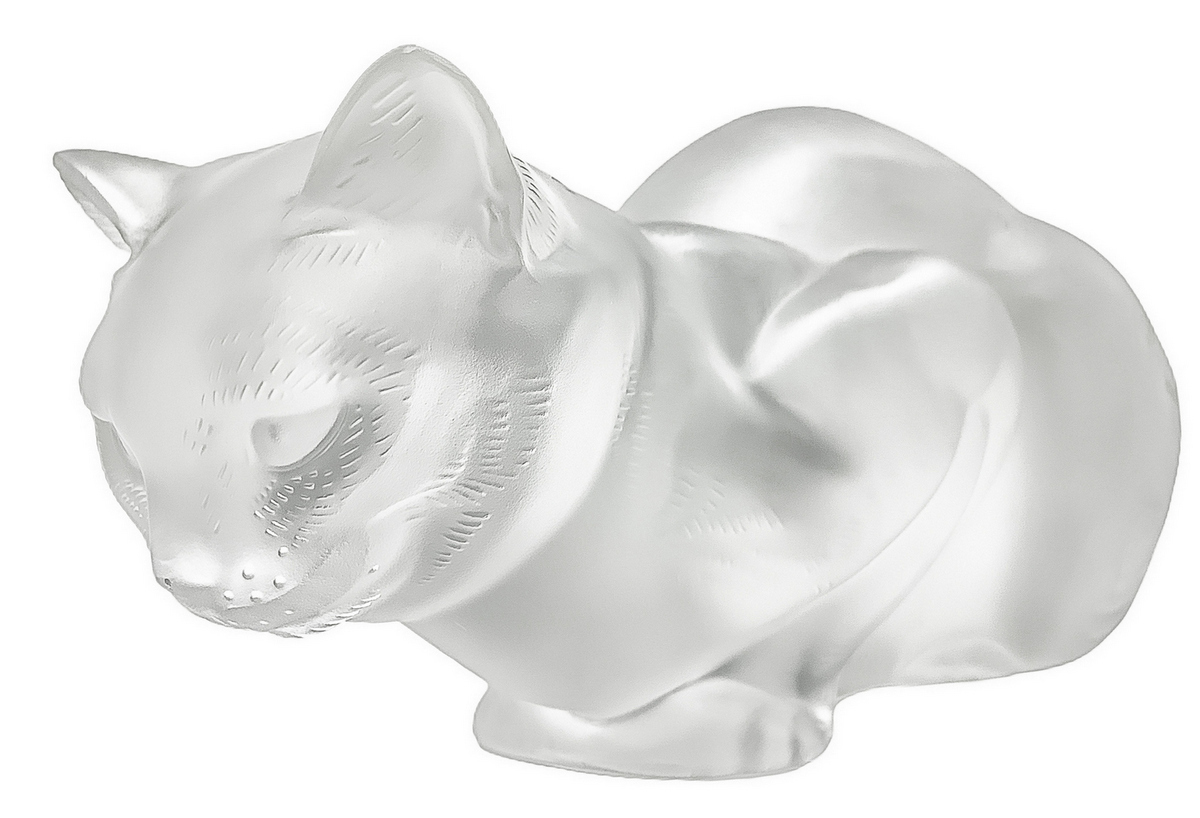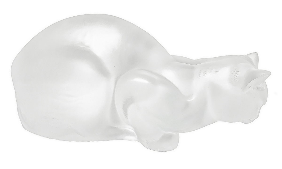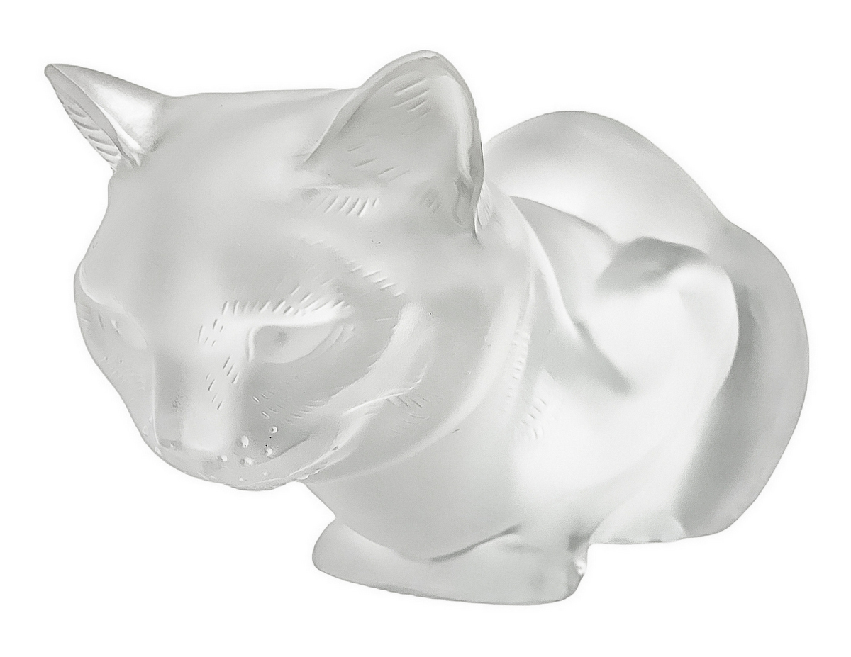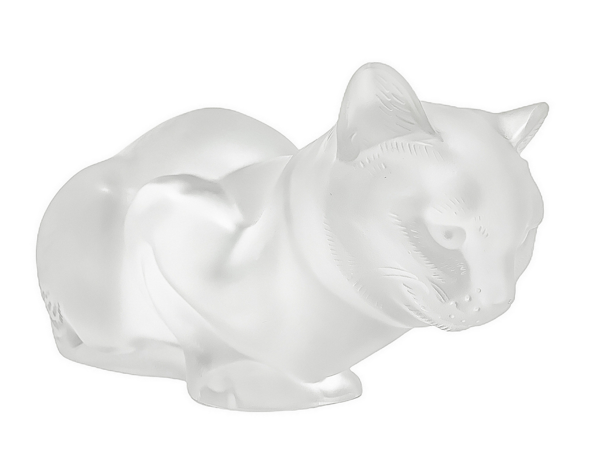 Lalique , scultura in vettro trasparente raffigurante gatto, con superficie acidata, anni '80. Firma incisa. H cm 11.x cm 21
