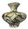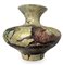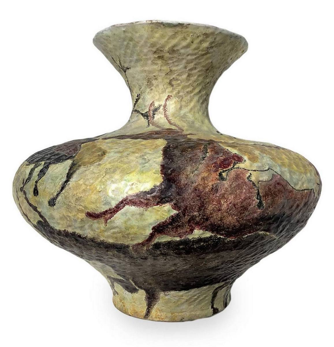 Vaso a balaustro in terracotta decorata in policromia riportante soggetti rupestri, fondo decorato con smalti a colaggio