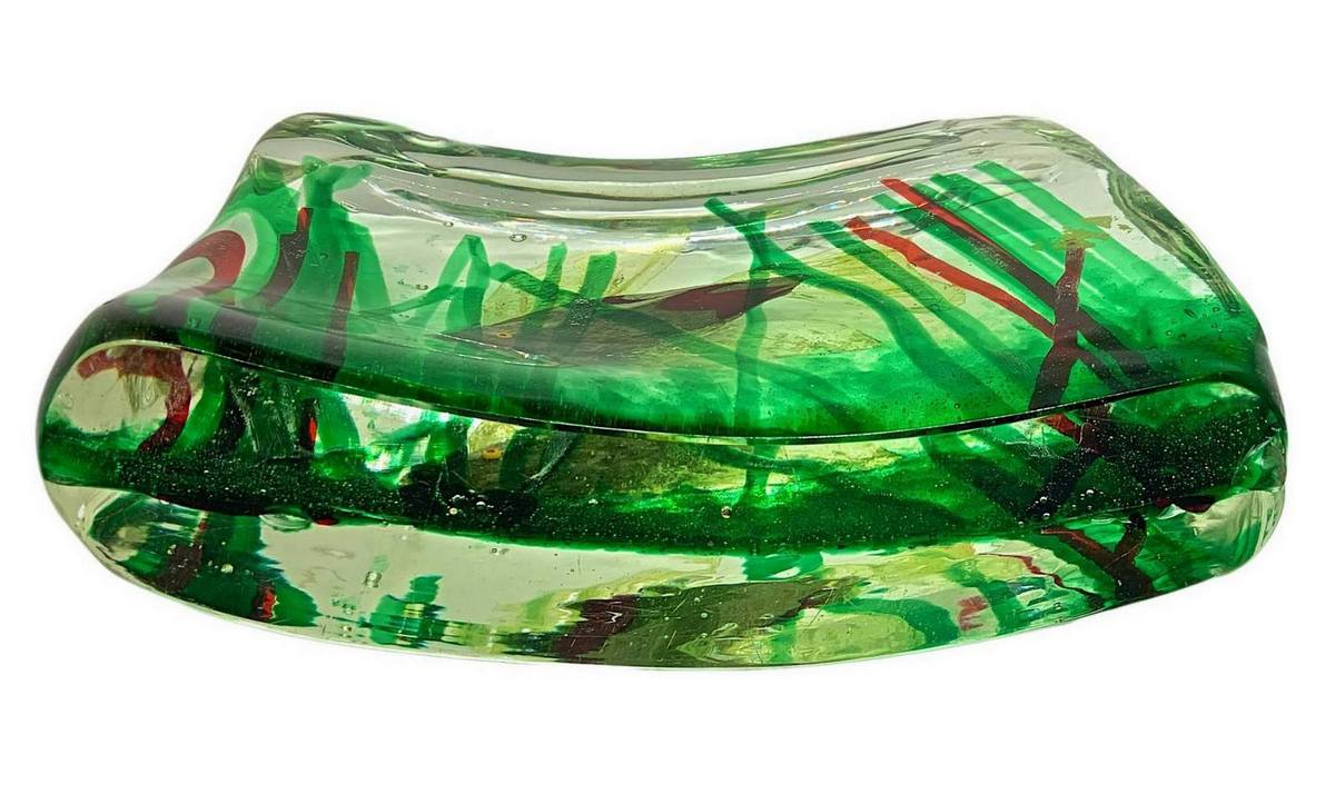 Scultura in vetro pesante raffigurante acquario, produzione Murano, produzione di Gino Cenedese, su disegno Riccardo Licata, attribuito. Con inclusioni policrome. Anni 60. H cm 15 x20