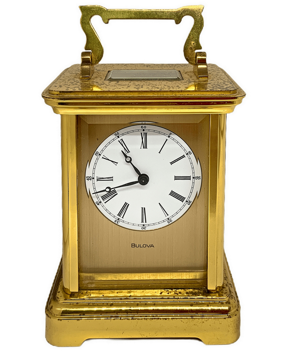Bulova, sveglia da viaggio a cassetta con struttura in metallo dorato e vetro molato, carica manuale. H cm 12x8,5. Profondità cm 7. Da revisionare