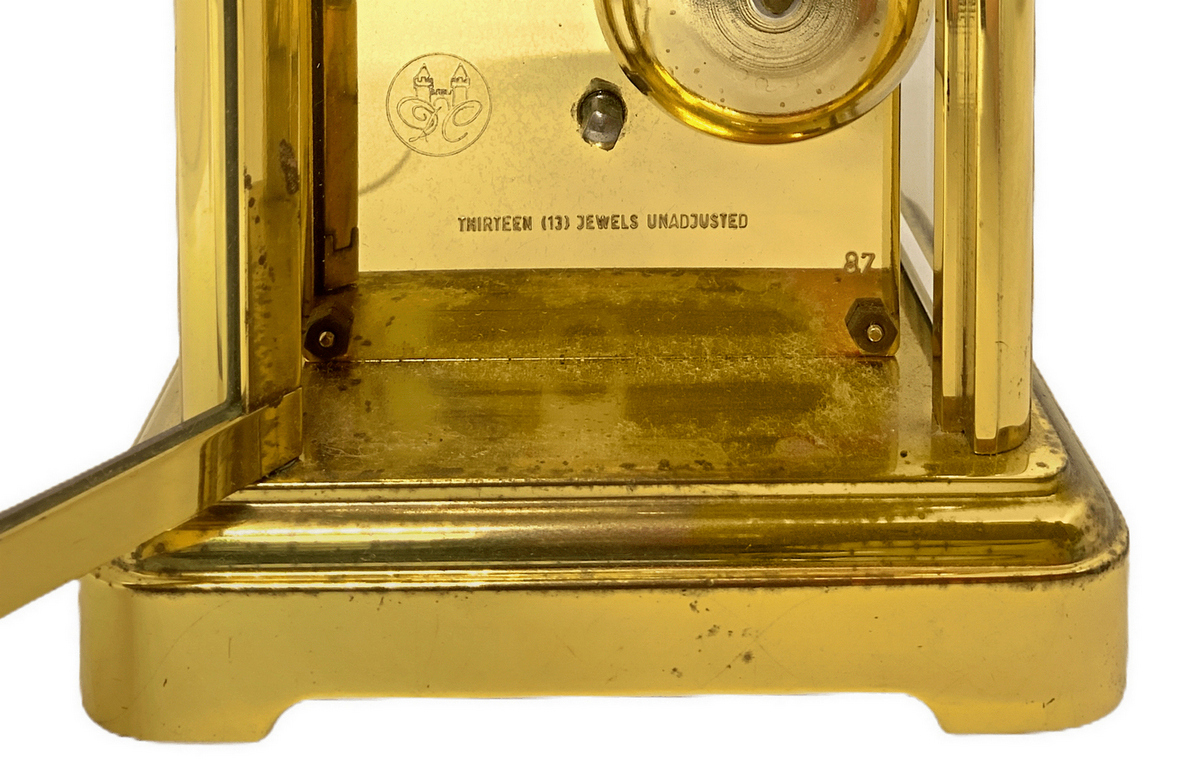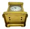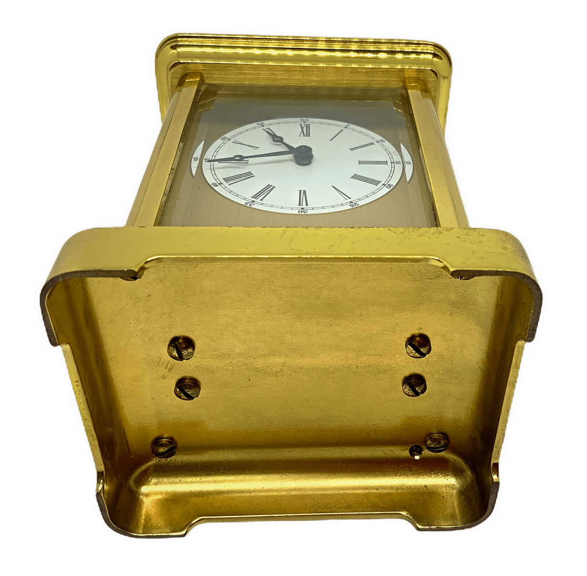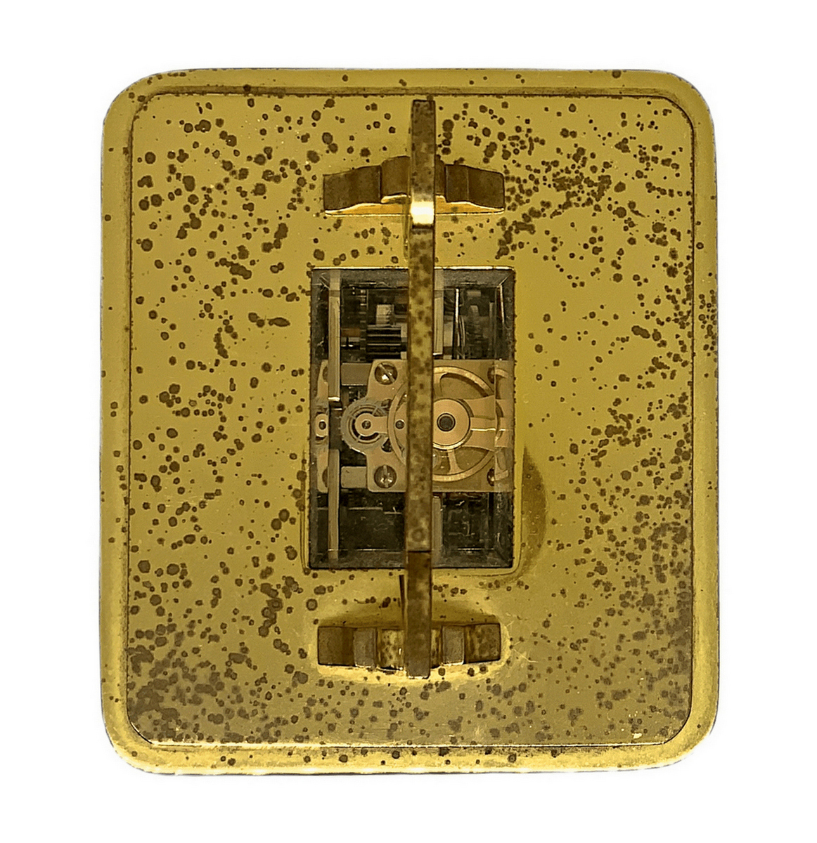 Bulova, sveglia da viaggio a cassetta con struttura in metallo dorato e vetro molato, carica manuale. H cm 12x8,5. Profo