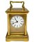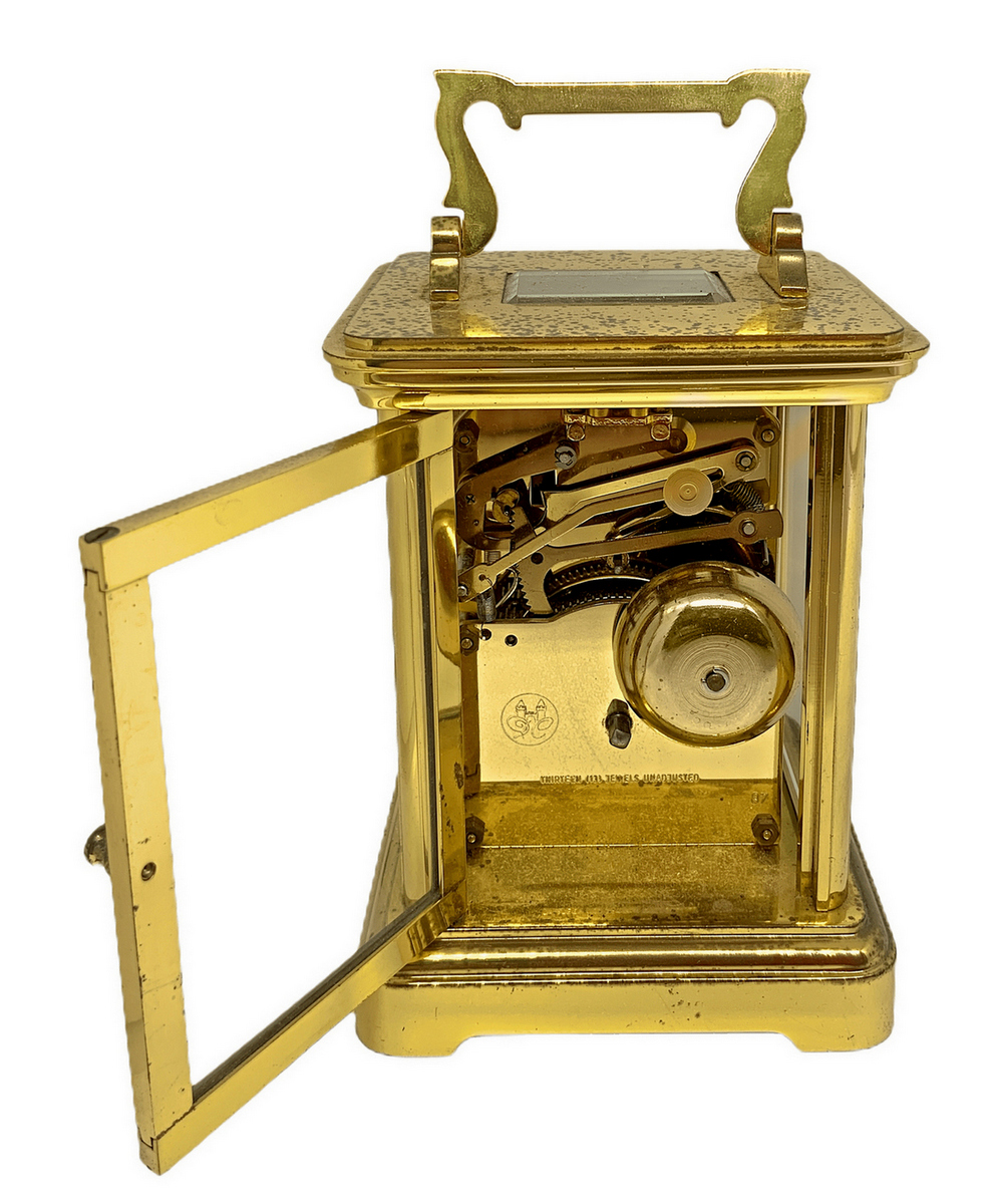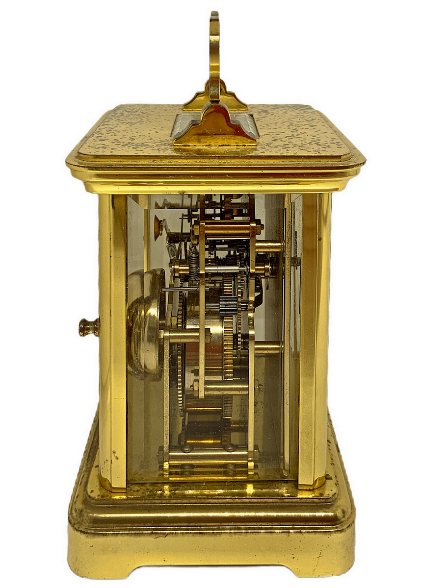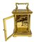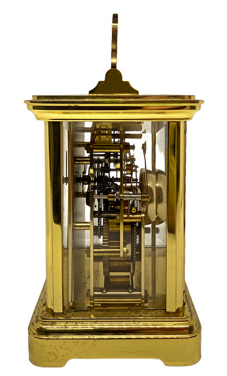 Bulova, sveglia da viaggio a cassetta con struttura in metallo dorato e vetro molato, carica manuale. H cm 12x8,5. Profo