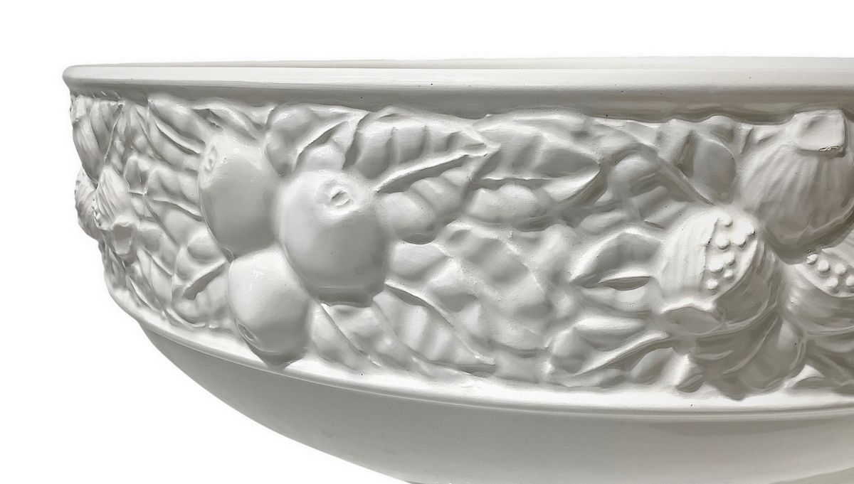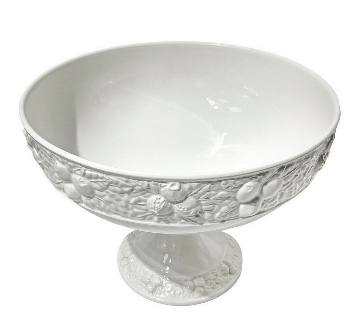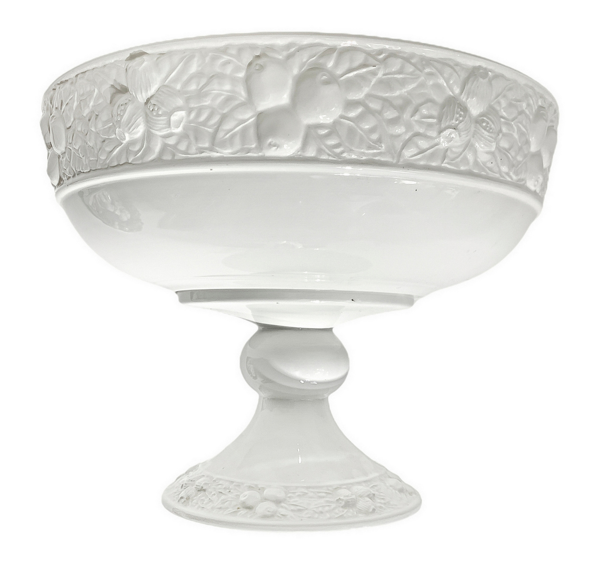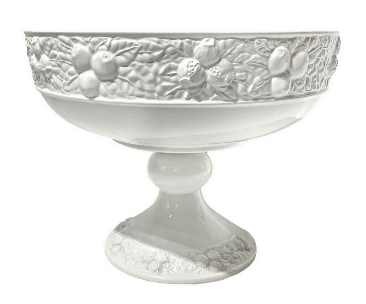 Alzata in pasta bianca, maiolica modellata a colaggio nei toni del bianco con raffigurazioni di frutti. H cm 30x39