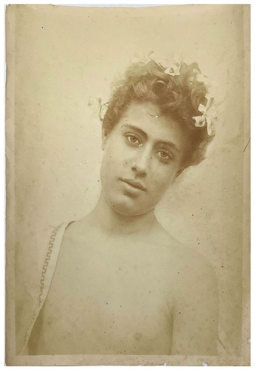 Wilhelm von Gloeden (1856-1931), stampa fotografica vintage su carta salata virata raffigurante “Testa di fanciullo con fiori” 1913Numerata “33”, datata 14-7-913 e timbrata al verso. Lievi mancanze sul bordo inferiore destro, qualc
