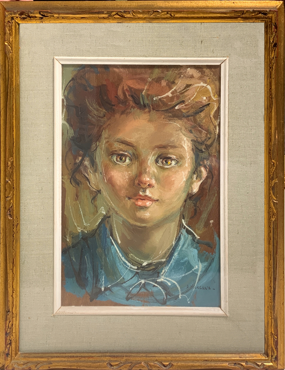 Dipinto ad olio su tela raffigurante volto di Giovane. Firmato in basso a destra Adalberto Morgana. Secolo XX Cm 30x20, in cornice cm 45x35