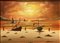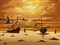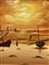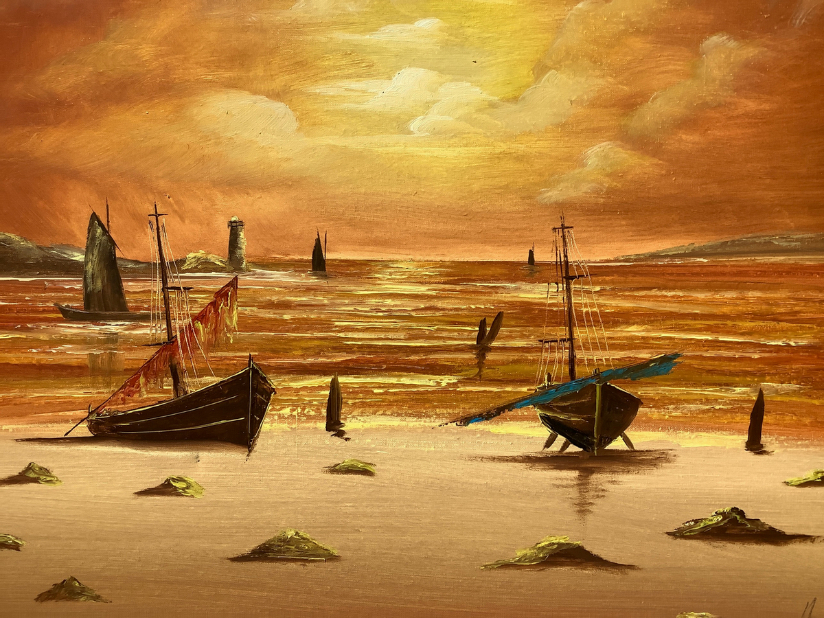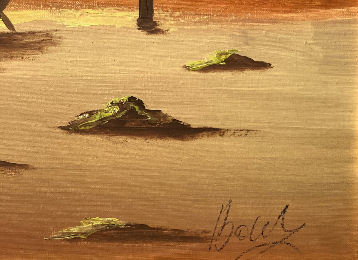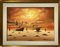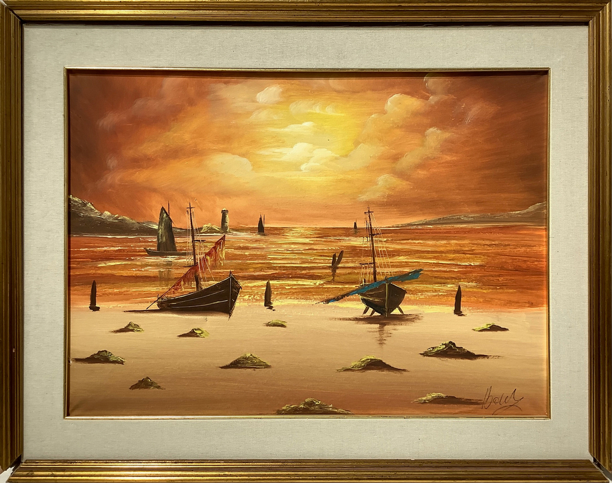 Dipinto ad olio su tela raffigurante marina con barche al tramonto, firmato Boely, pittore XX secolo. Cm 68x48, in corni