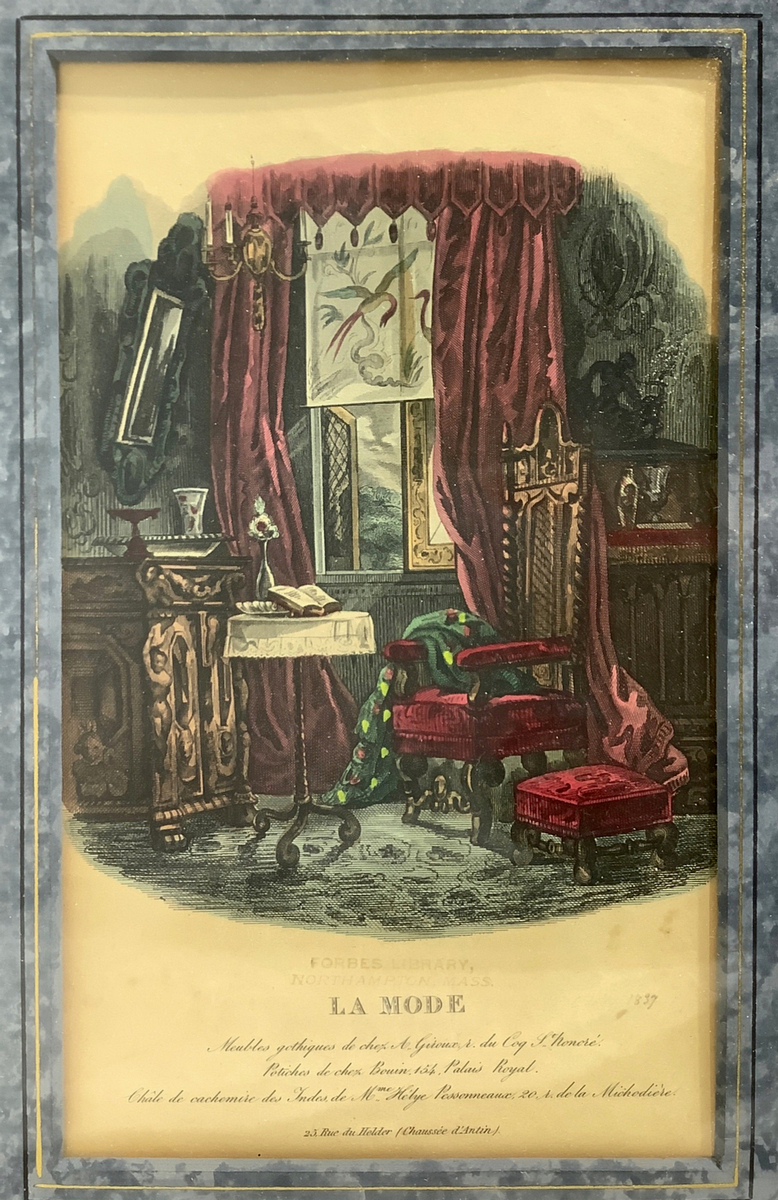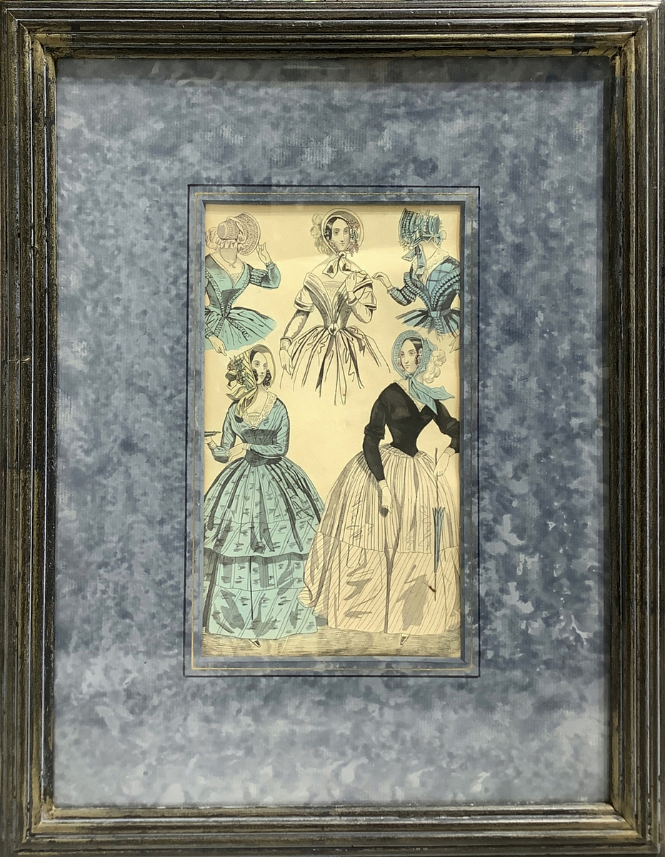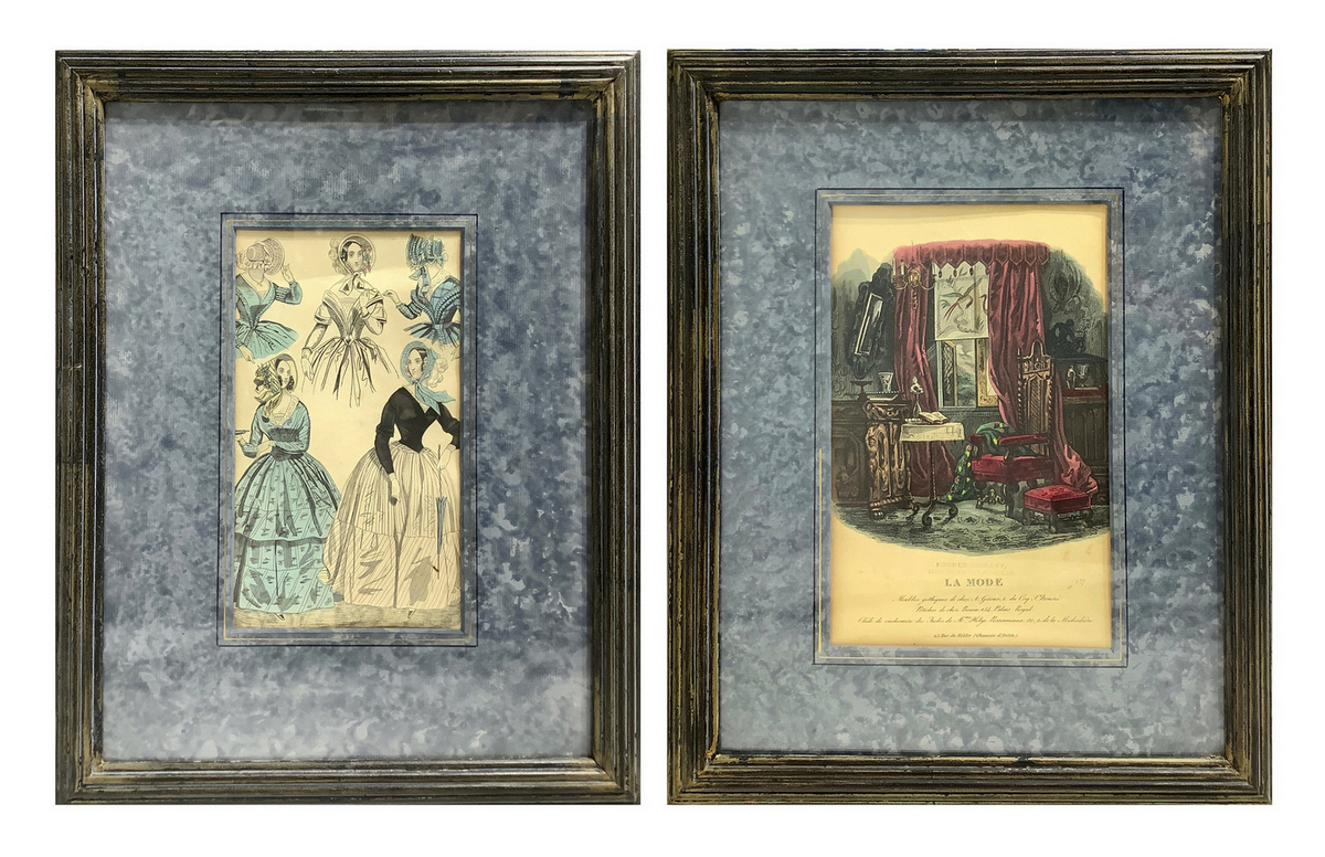 Coppia di stampe, inizia XX secolo, raffiguranti abiti di moda femminili e dimora di A. Guoux. Cm 23x14, in cornice cm 38x30