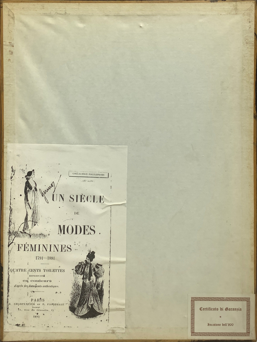 Lot 376 | Coppia di stampe, inizia XX secolo, raffiguranti abiti di moda femminili e dimora di A. Guoux. Cm 23x14, in cornice cm 3