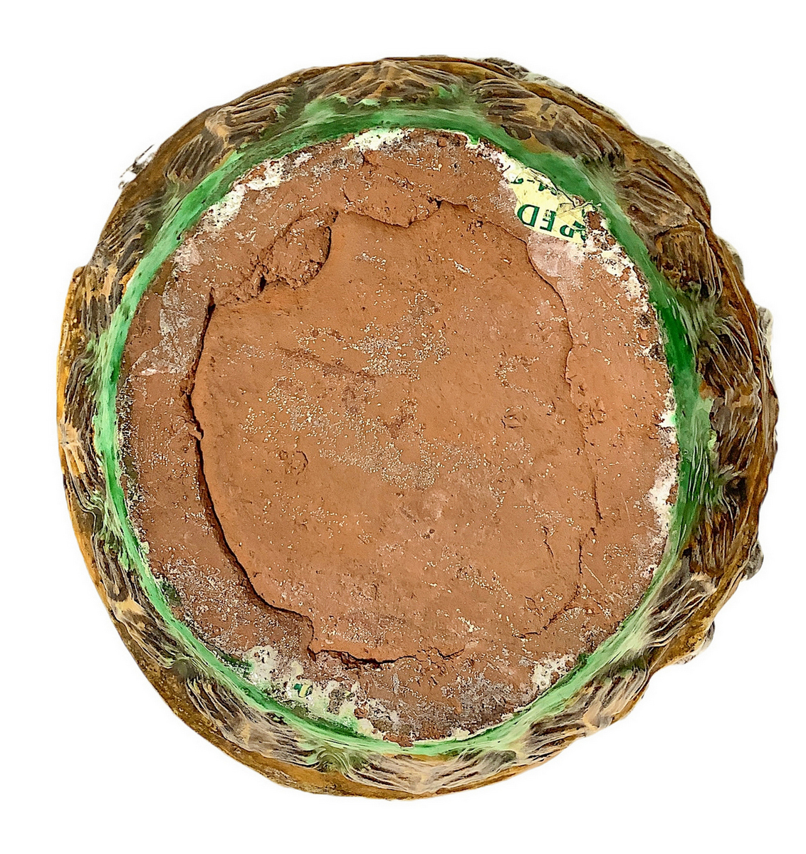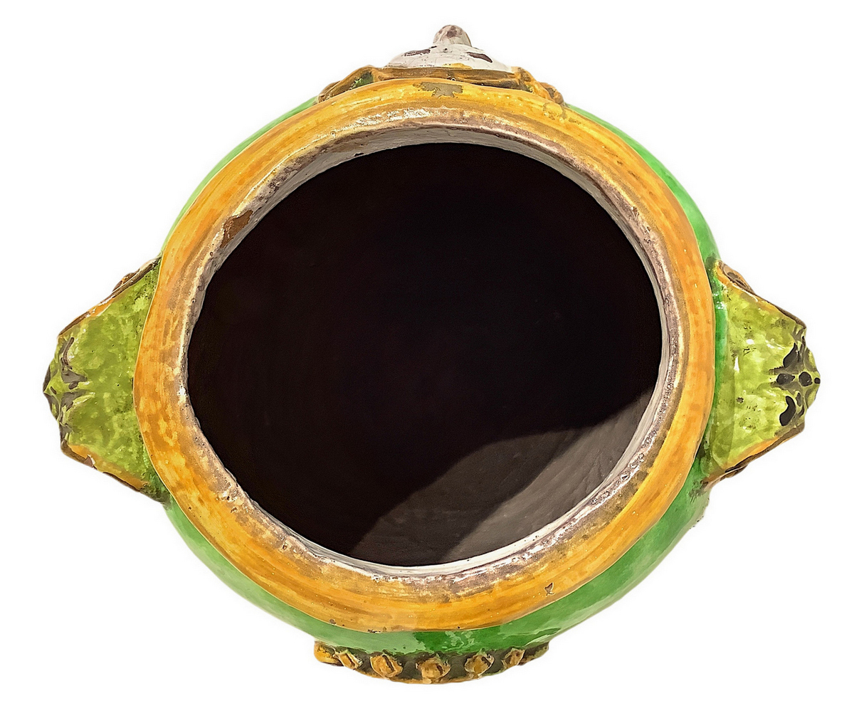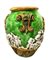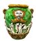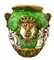 Cachepot in maiolica verde e giallo con figurazioni a bassorilievo bianco. Caltagirone. XX secolo. H cm 45, bocca cm 28