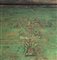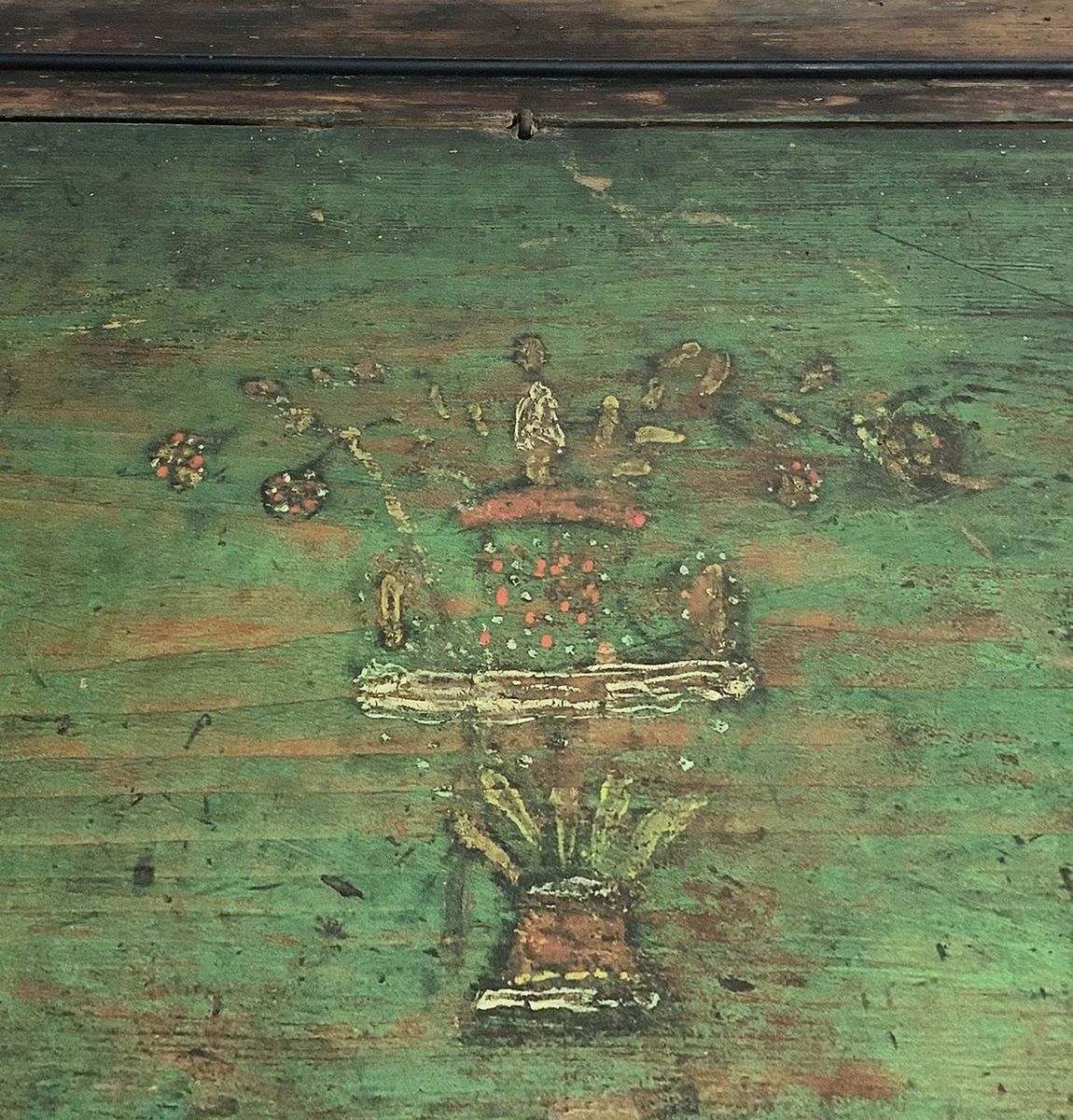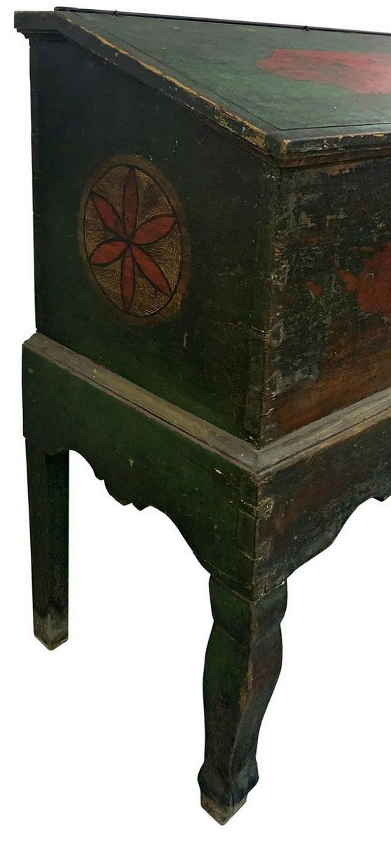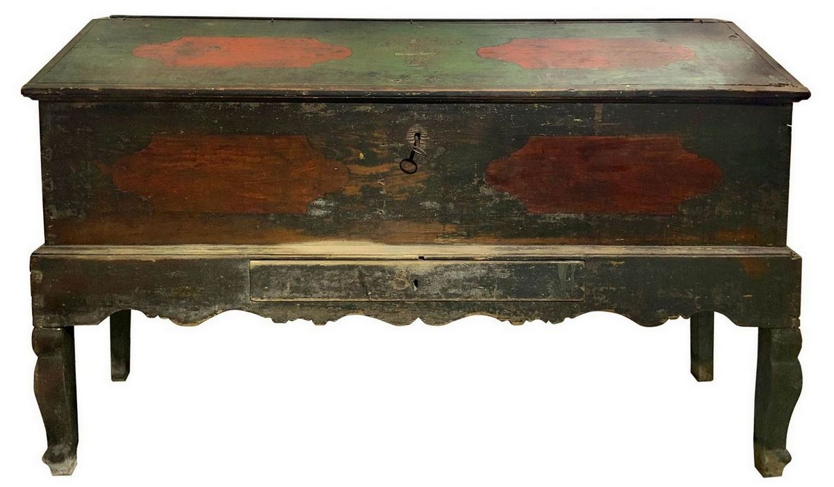 Cassapanca dipinta in legno laccato a riquadri rossi. Fine XVIII secolo. H Cm 112. Cm 182x56