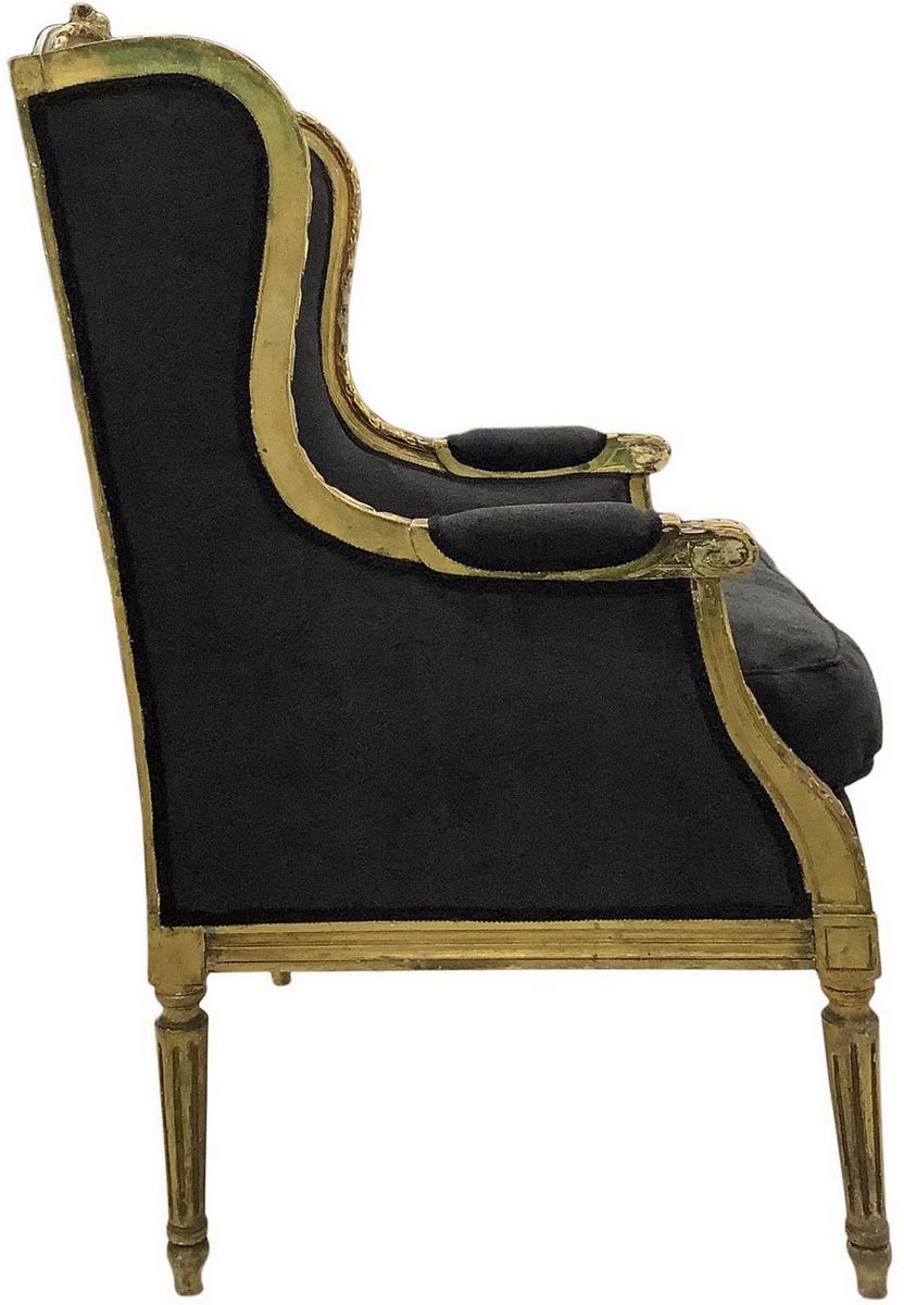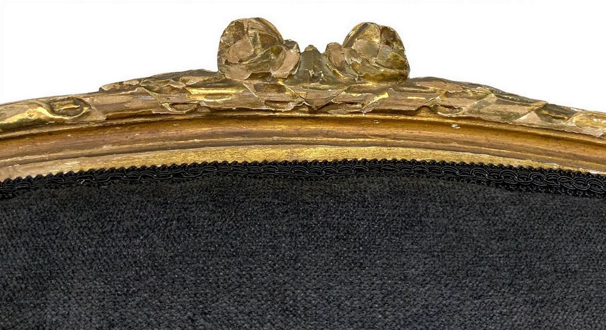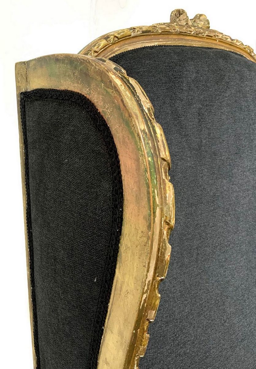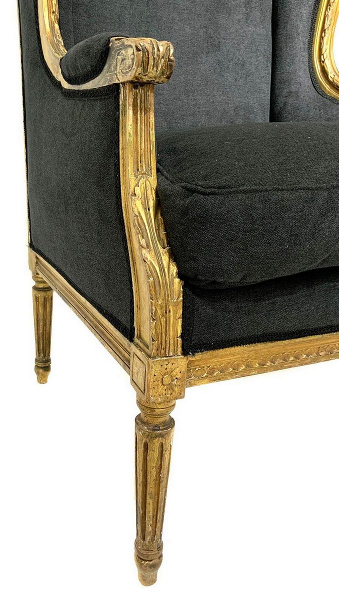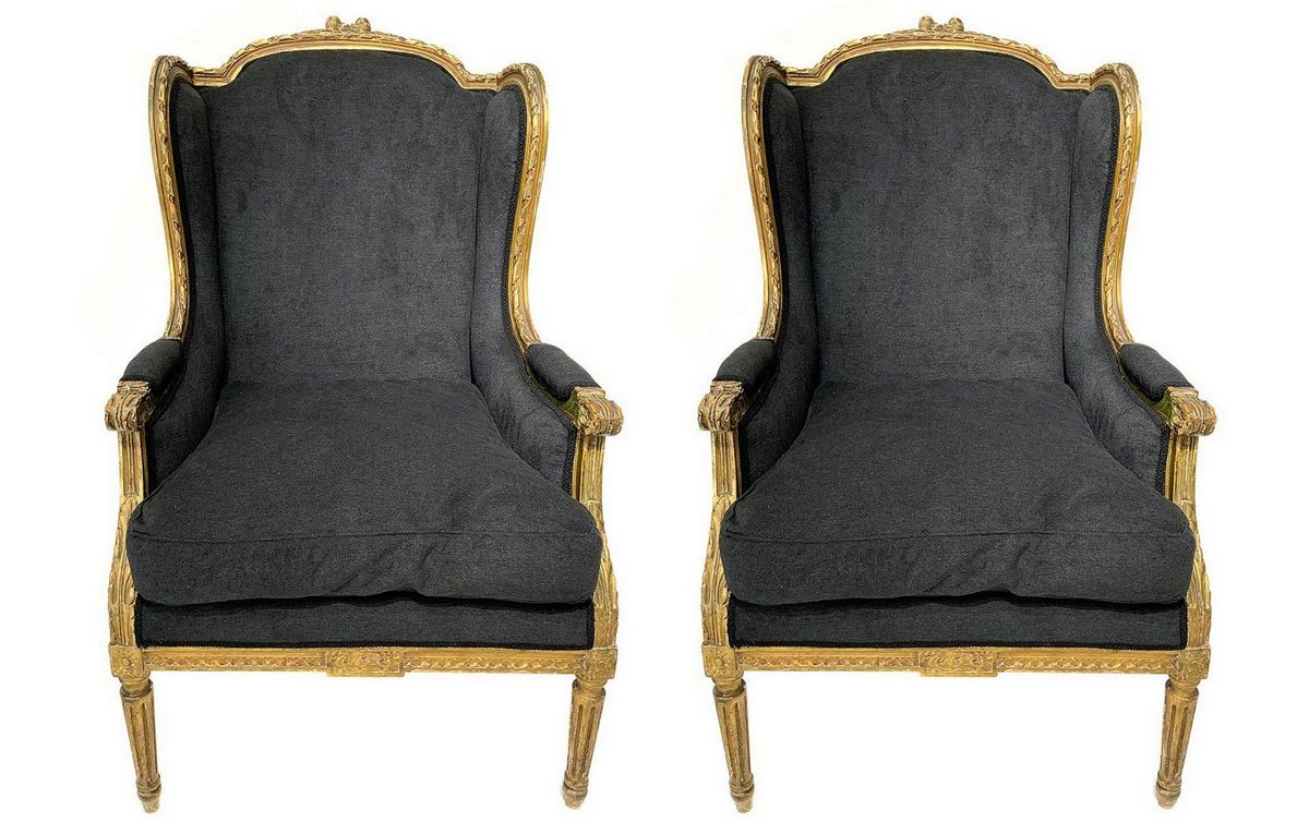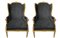 Coppia di poltrone bergère in legno dorato, XX secolo. Ricondizionate in stoffa grigio antracite. Cm 107x57x56.