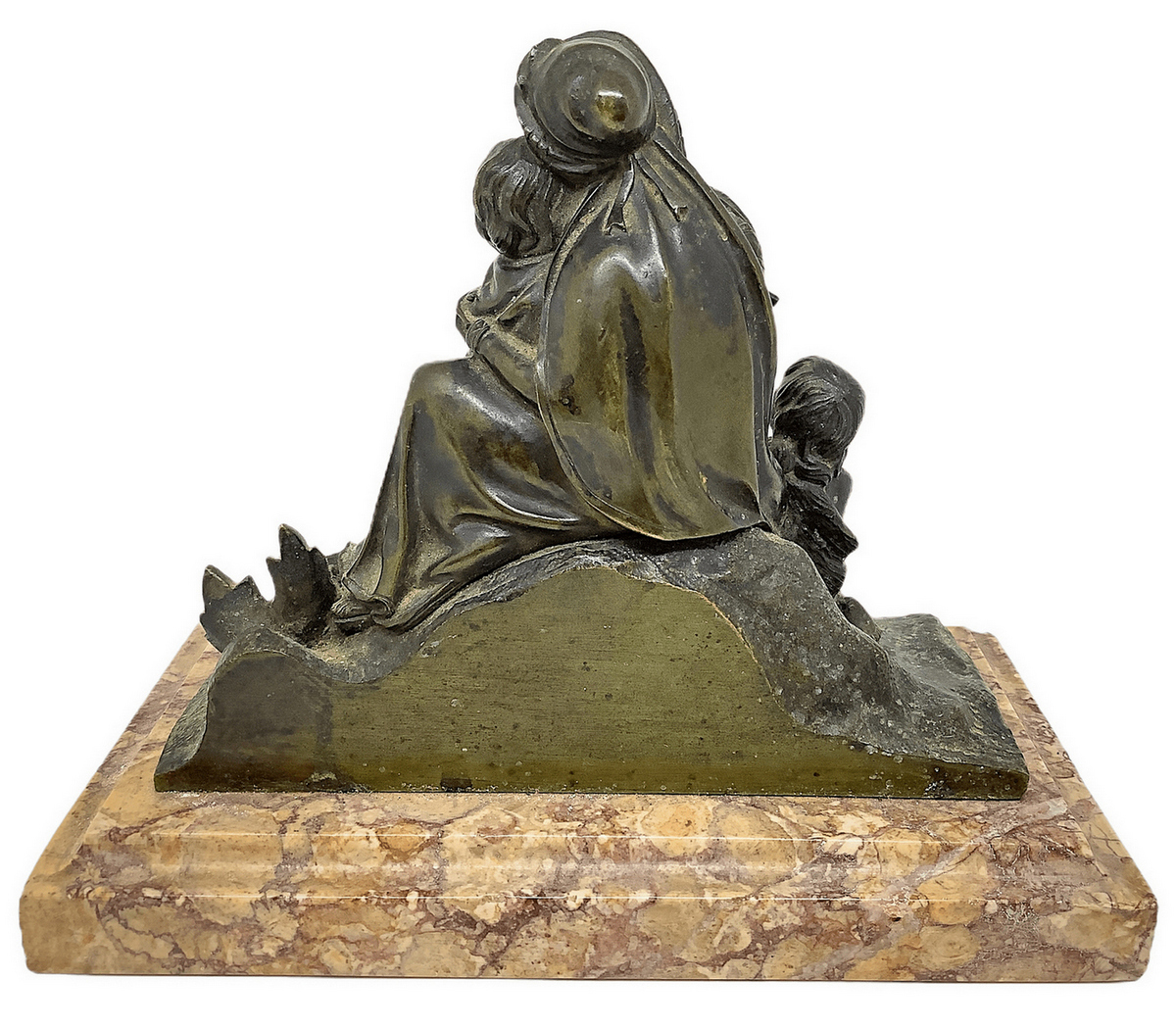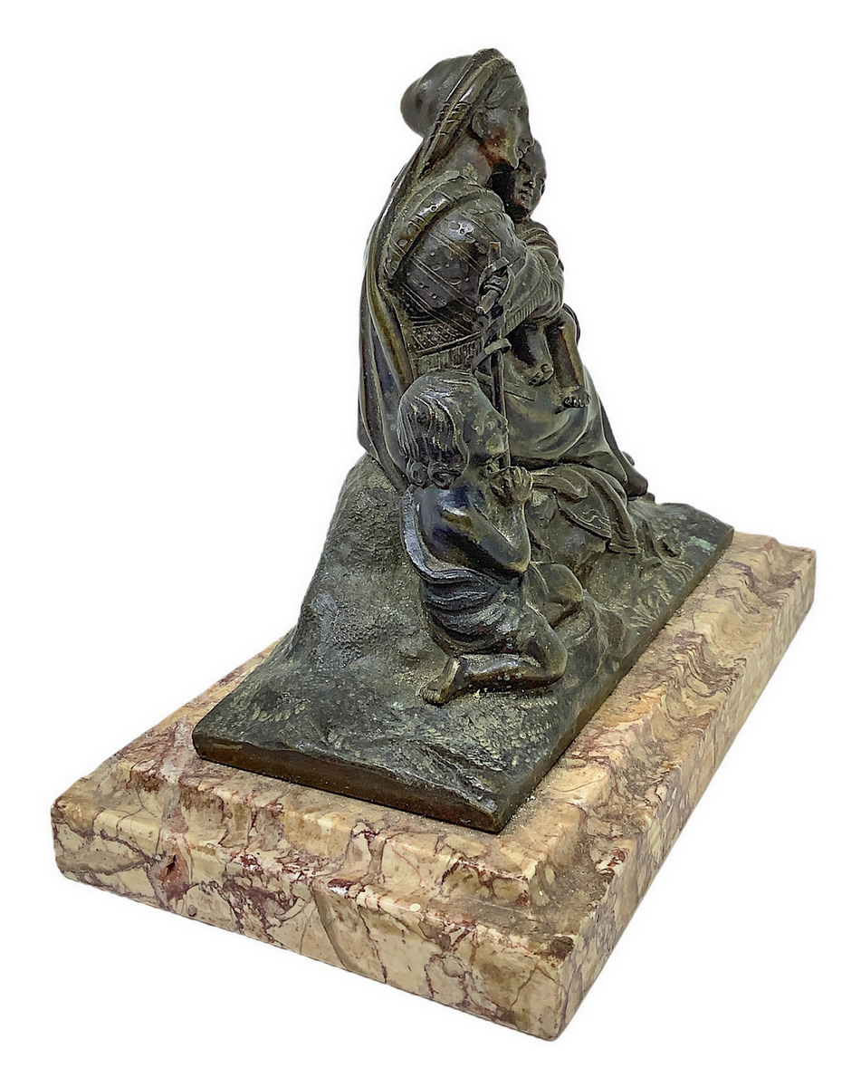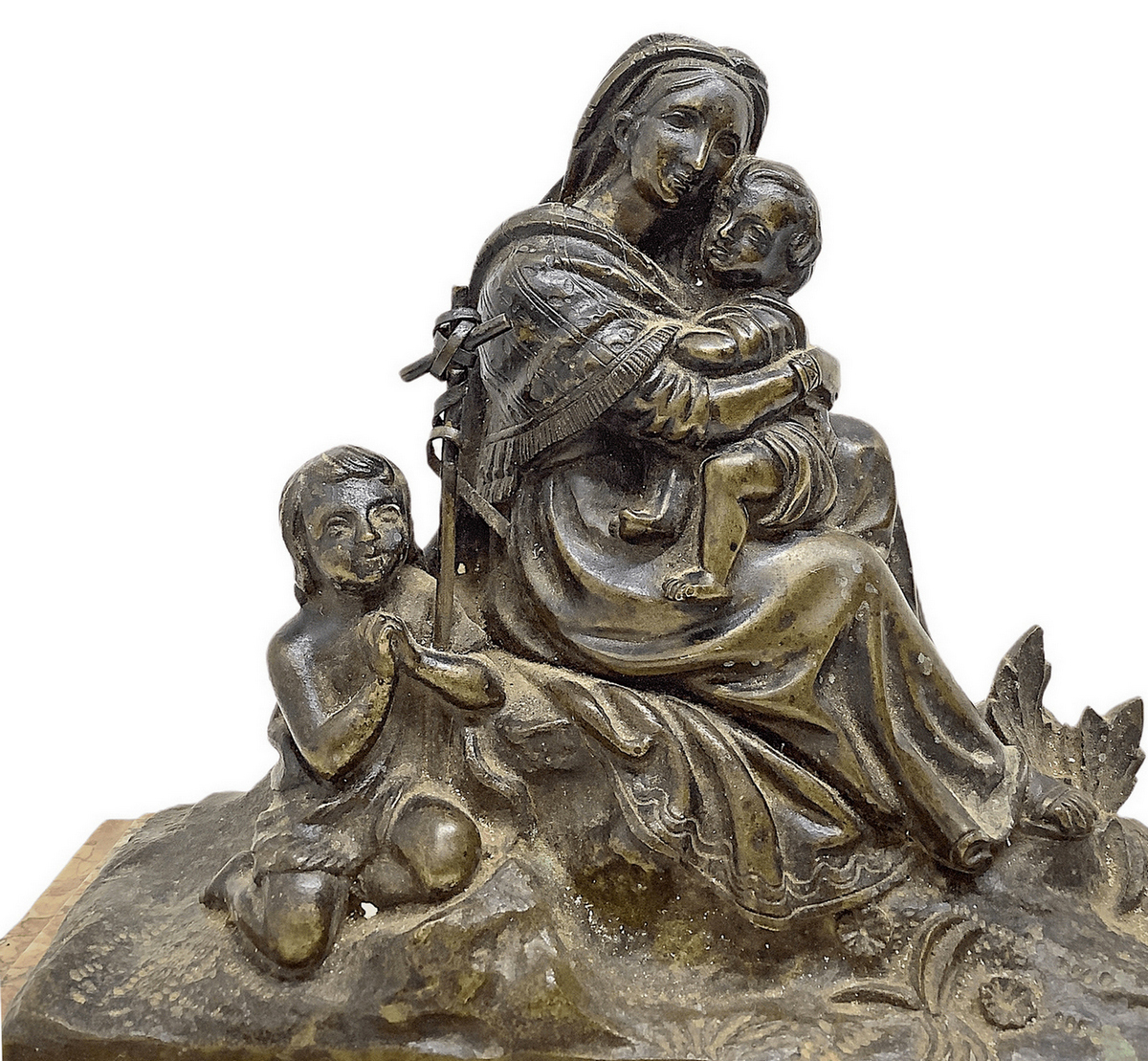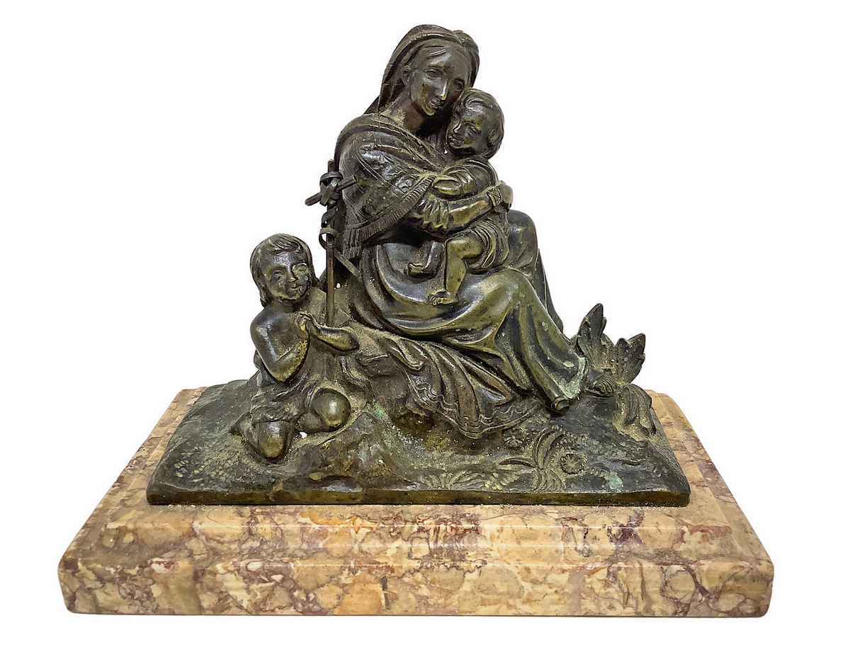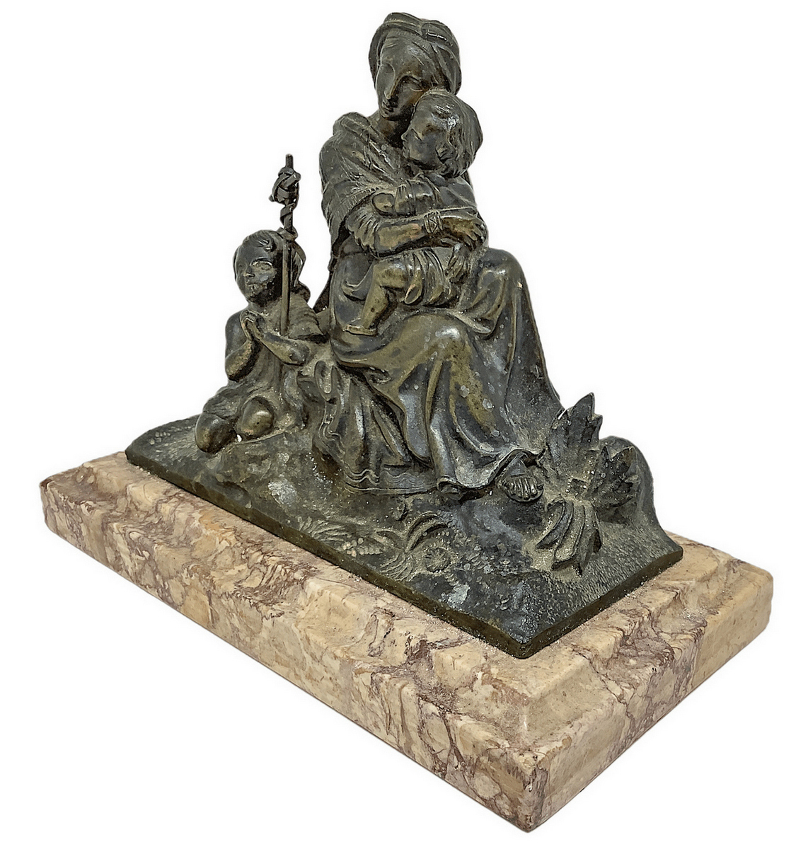 Bronzo raffigurante Madonna con bambino e San Giovannino su base di marmo. Inizi XX secolo. H cm 15. Base cm 19x10,5