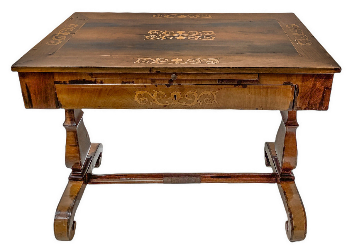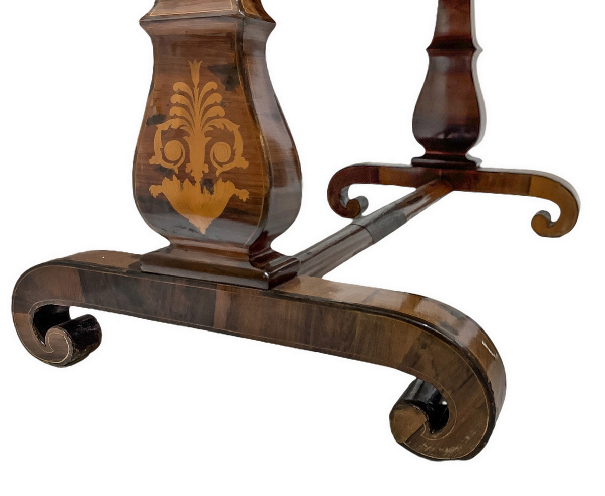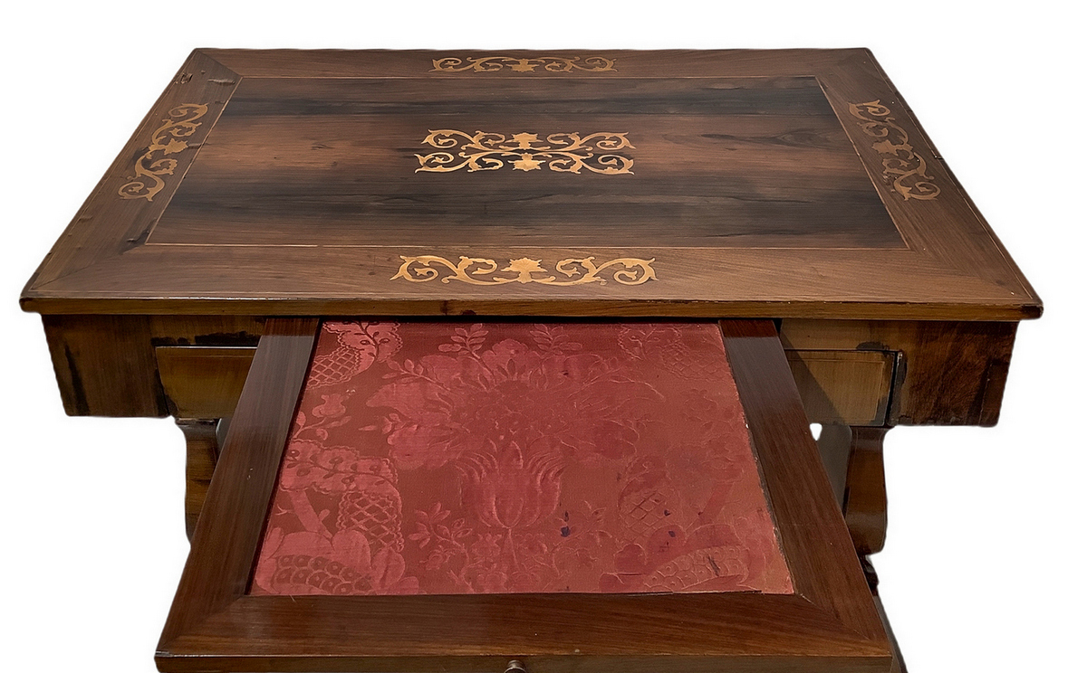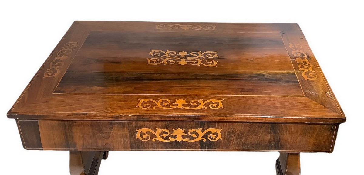 Scrittoio Carlo X in legno di palissandro con intarsi sul piano e ai lati. Gambe a lira con legaccio centrale. Cassetto centrale. XIX secolo. H cm 83. Larghezza cm 115. Profondità cm 73
