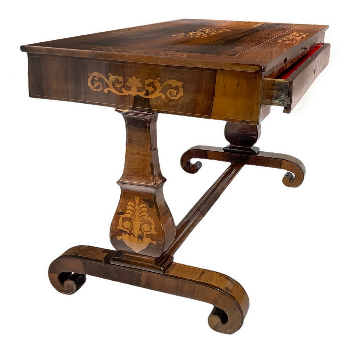 Scrittoio Carlo X in legno di palissandro con intarsi sul piano e ai lati. Gambe a lira con legaccio centrale. Cassetto