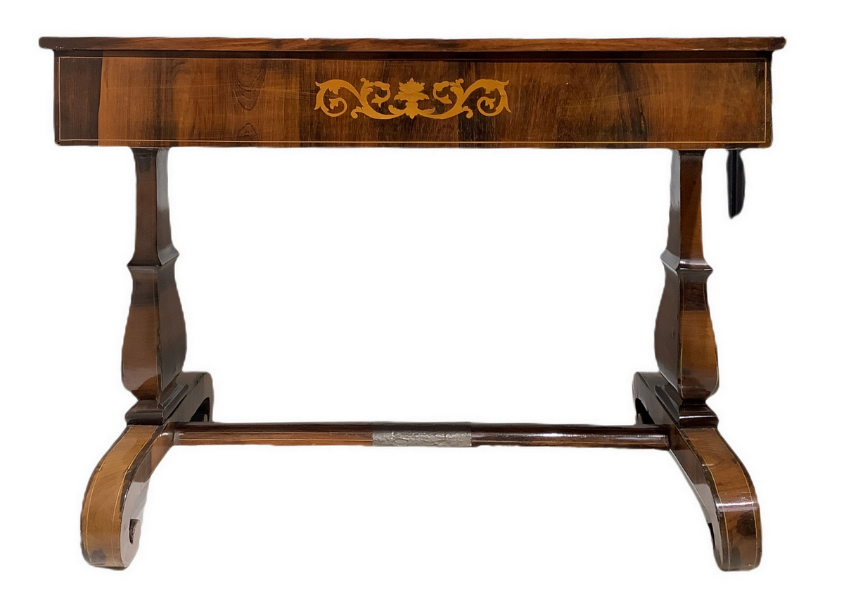 Lot 404 | Scrittoio Carlo X in legno di palissandro con intarsi sul piano e ai lati. Gambe a lira con legaccio centrale. Cassetto