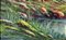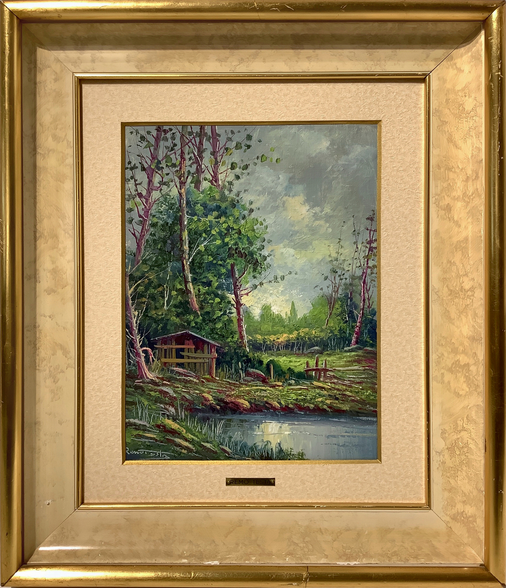 Dipinto ad olio su tela su supporto rigido raffigurante cascina con alberi sul lago, Remo Testa, XX secolo. Cm 27x36, in cornice cm 59x49
