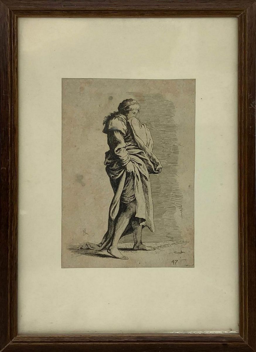 Incisione ad acquaforte a punta secca Salvator Rosa (Napoli 1615-Roma 1673) raffigurante donna che si copre il viso, tratto da "Diverse figure " Incisione all’acquaforte da lastra di rame, mm140x90, in cornice mm 265x180. Monogrammata a sinistra e numer