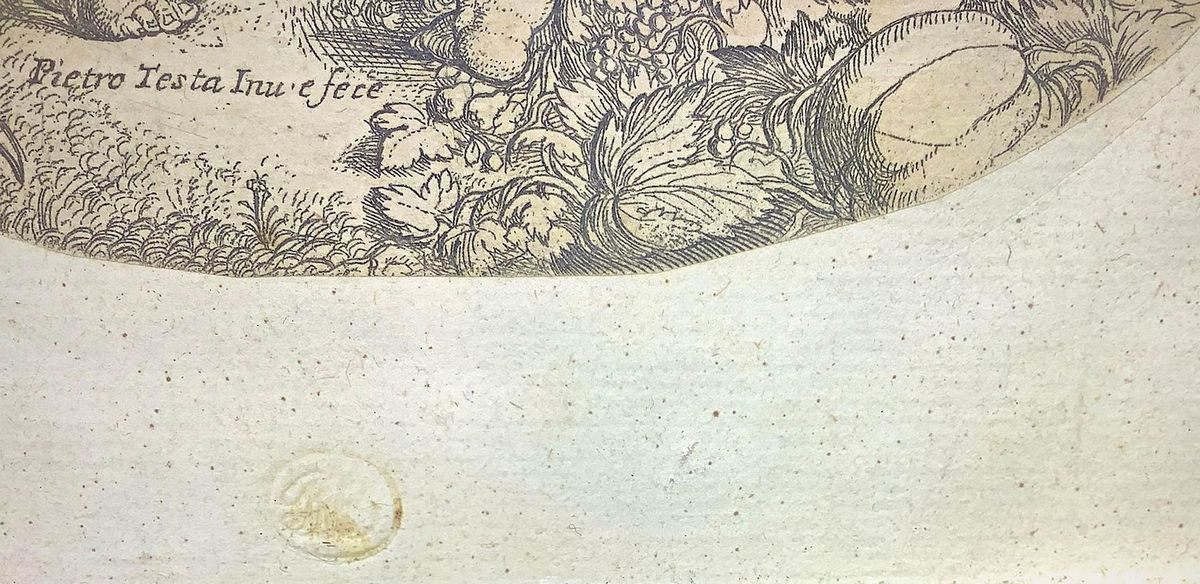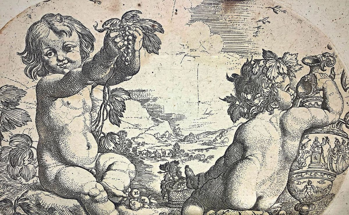 Pietro Testa detto il Lucchesino (Lucca 1611 - Roma 1650), incisione ovale raffigurante due putti baccanti. Incisione al