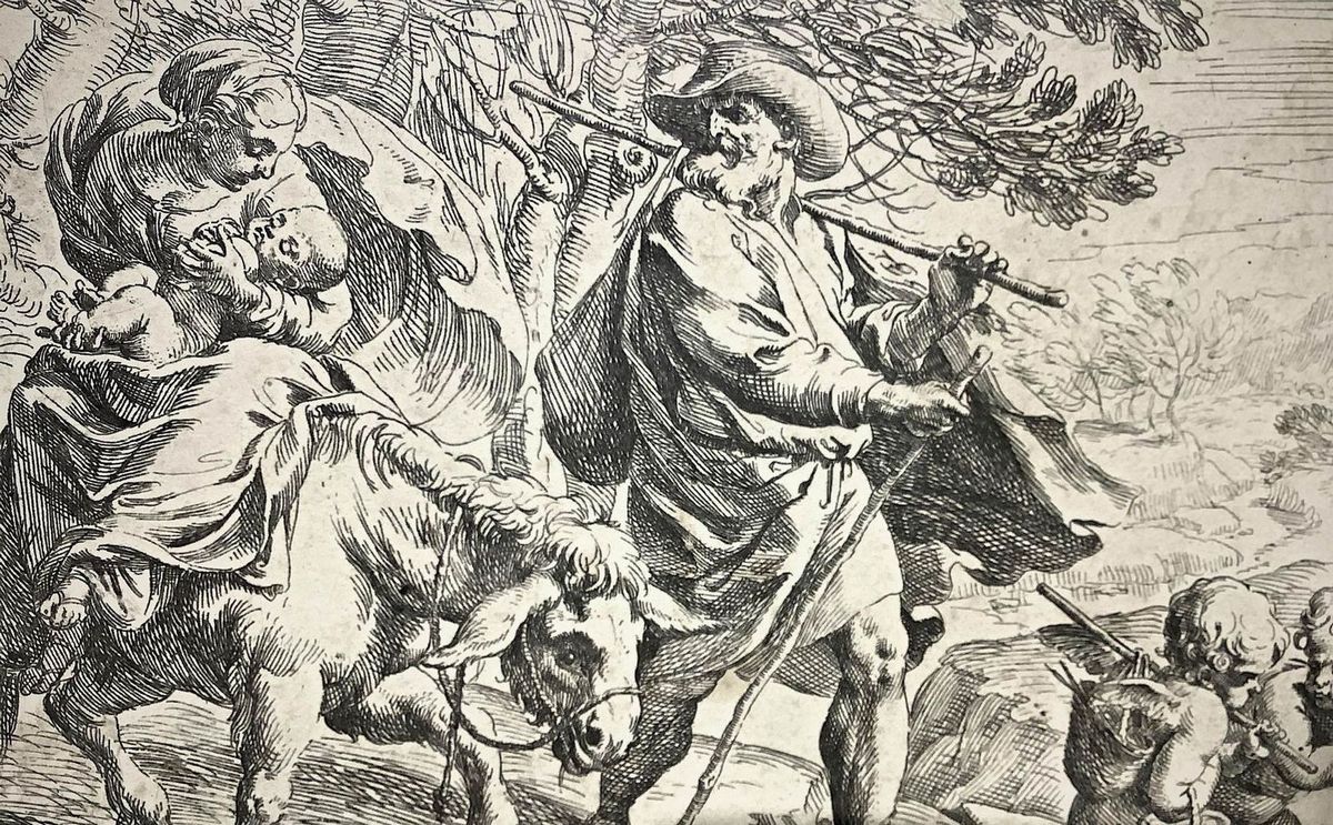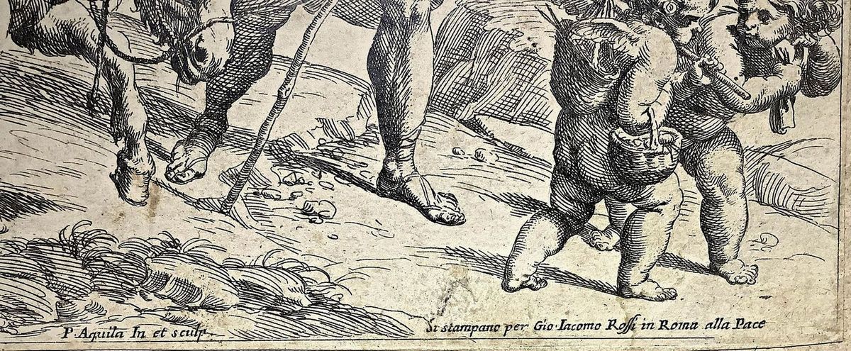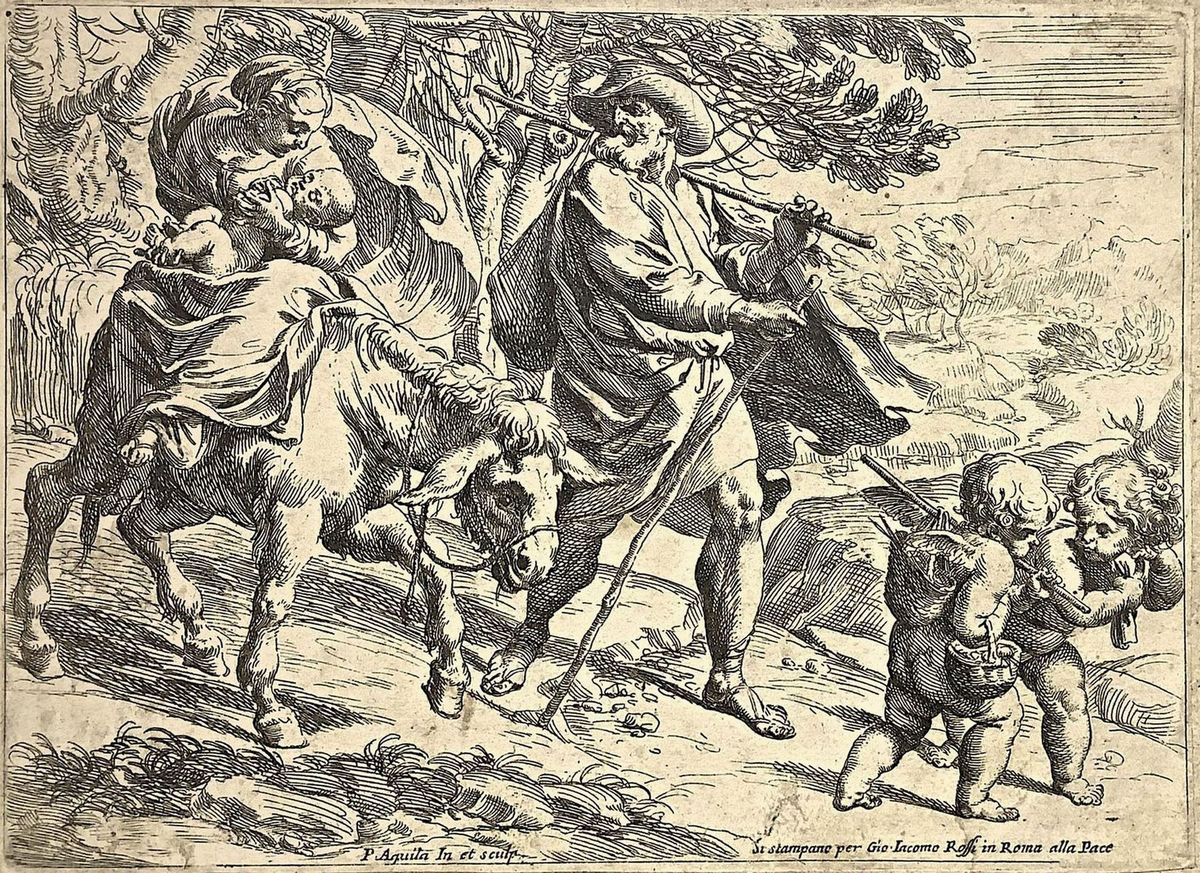 Pietro Aquila (Marsala 1650- Roma 1692) , incisione raffigurante Fuga in Egitto. Incisione all'aquaforte. Mm 140 X181, i
