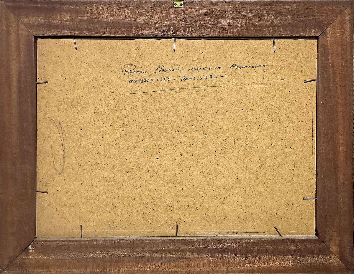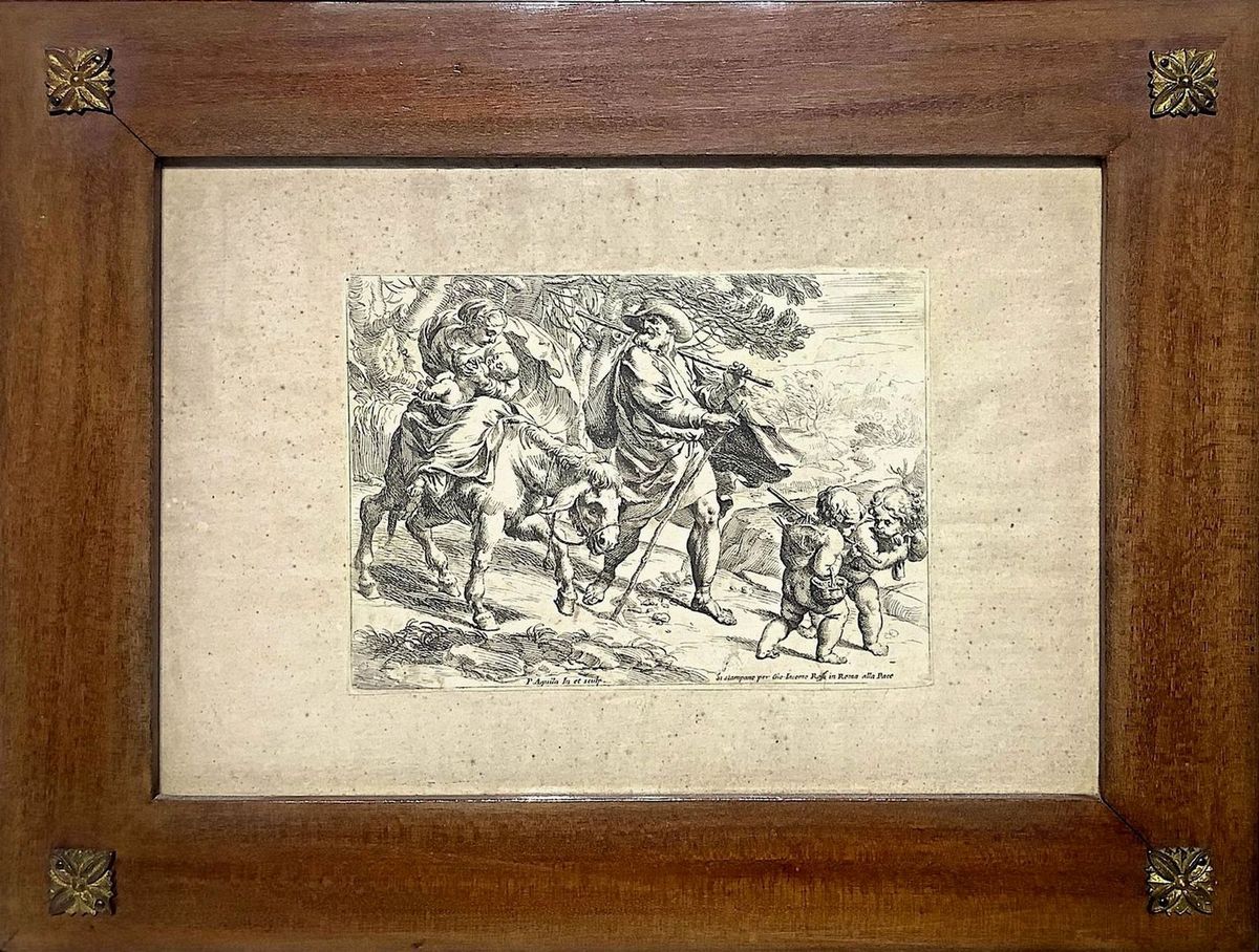 Pietro Aquila (Marsala 1650- Roma 1692) , incisione raffigurante Fuga in Egitto. Incisione all'aquaforte. Mm 140 X181, in cornice noce con inserti in ottone agli angoli CM 30x39,5.