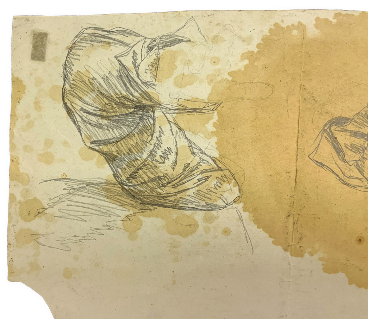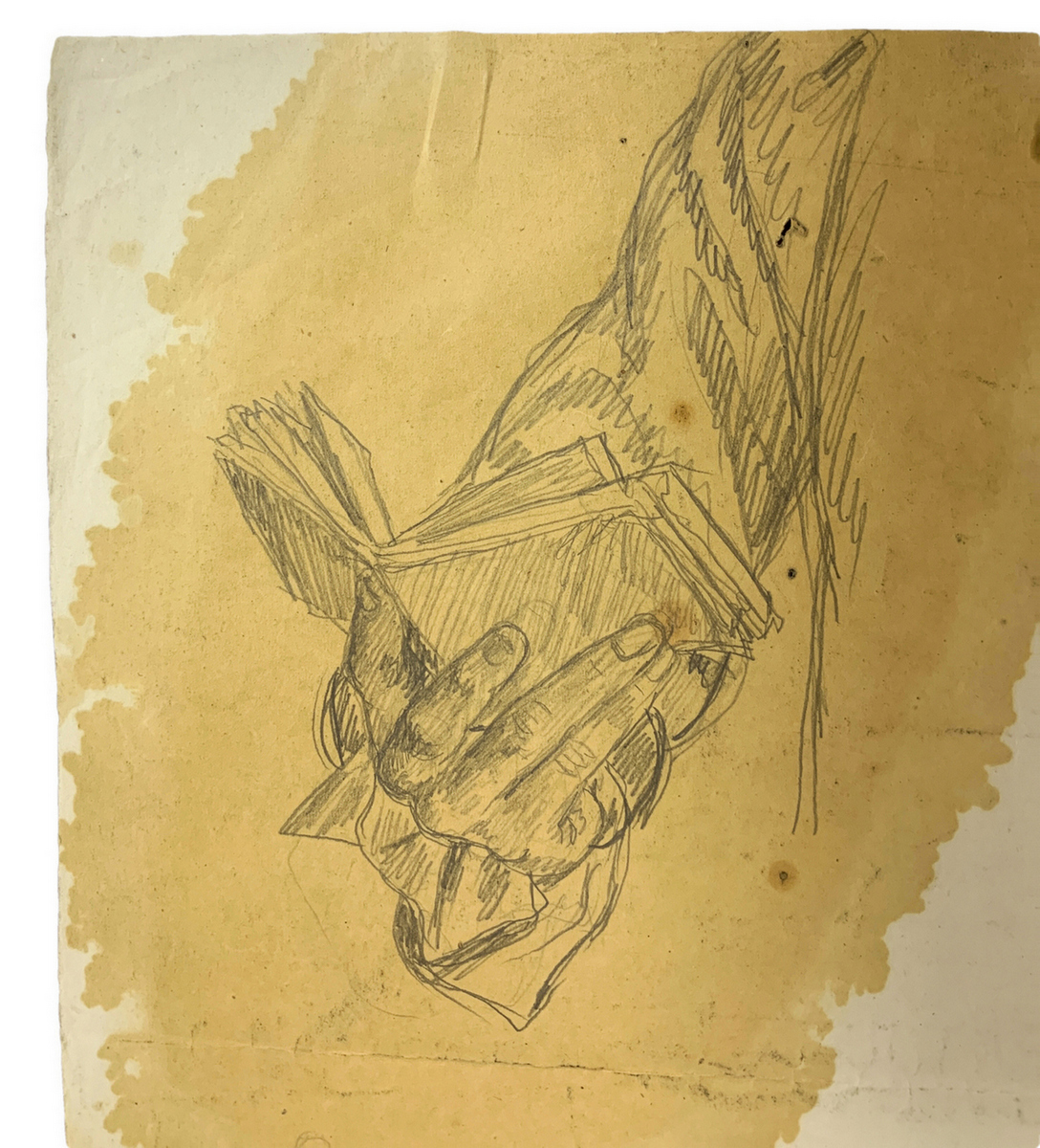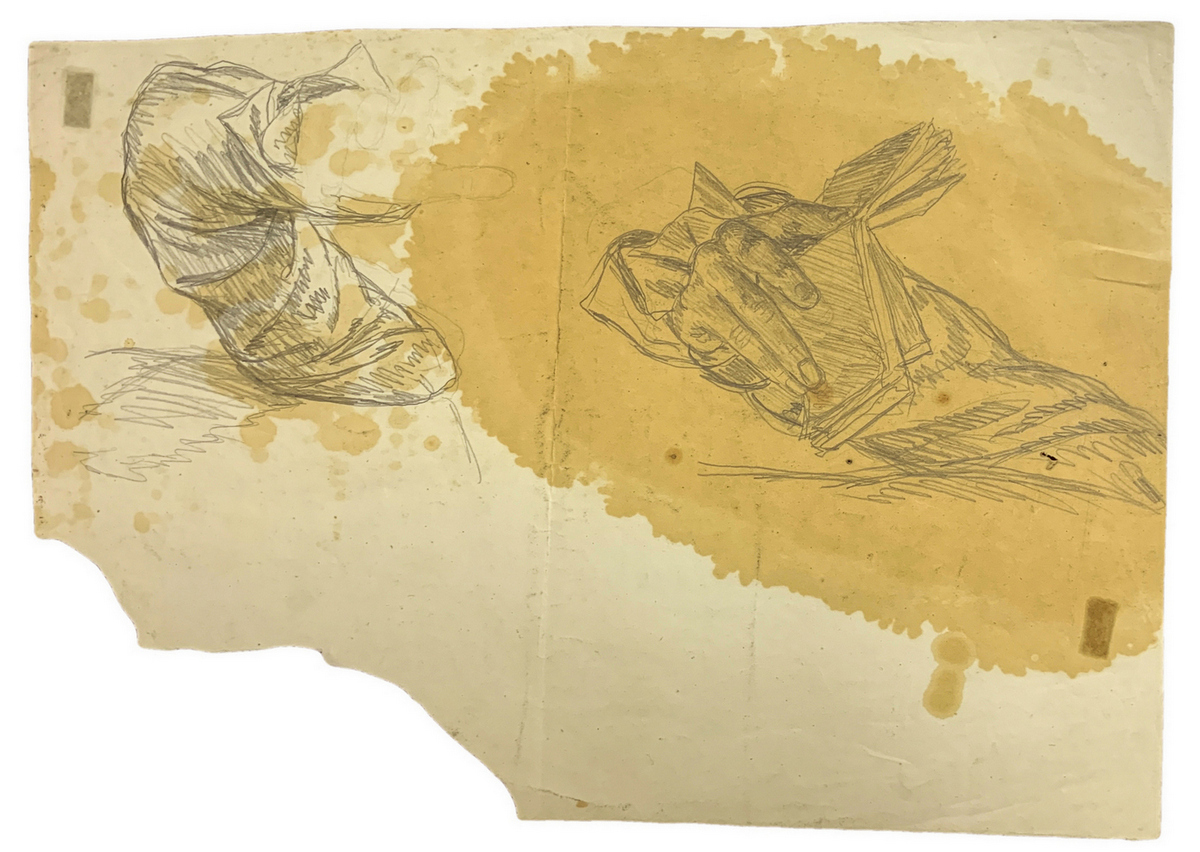 Disegno a matita su frammento di carta in parte seppiata, raffigurante studio di mani e braccio. XIX secolo. Mm 305x200