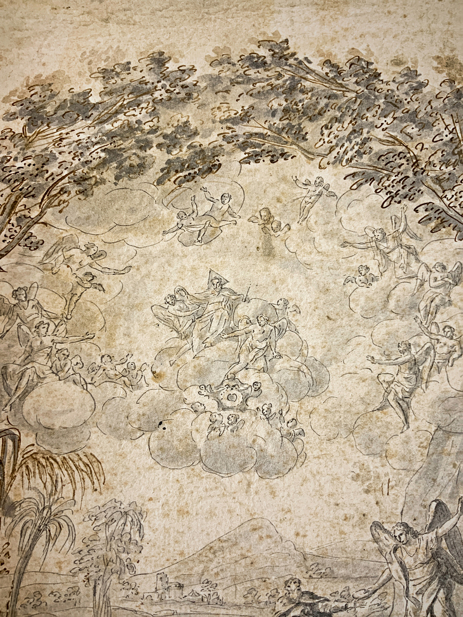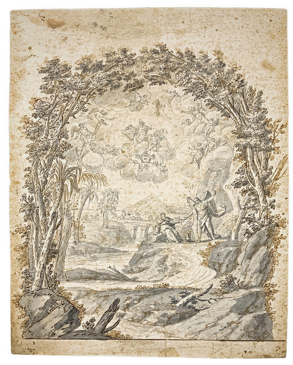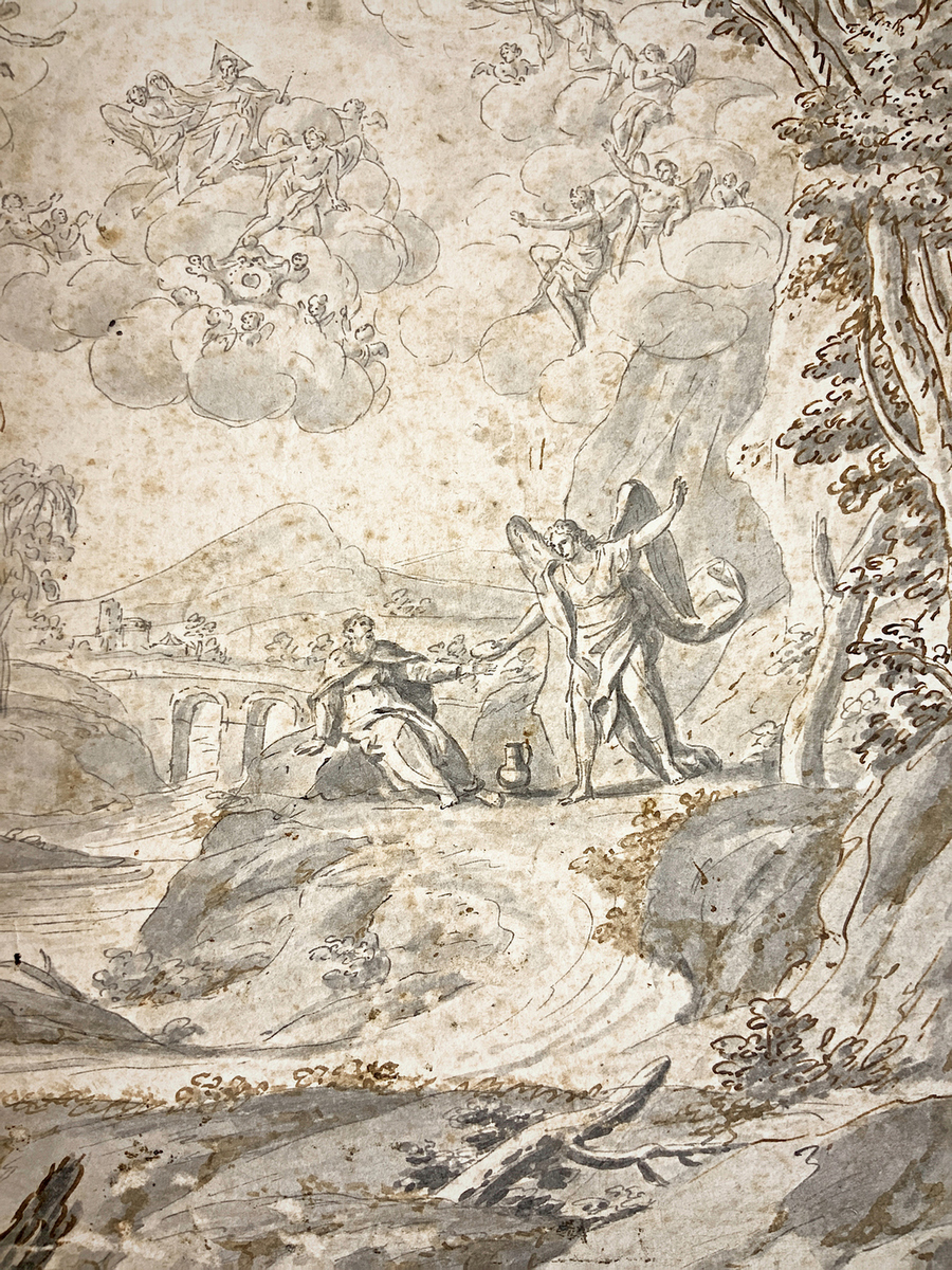 Gaspard Dughet, attr. (Roma 1615-1675). Disegno ad inchiostro bruno e inchiostro grigio su carta antica vergellata raffigurante Elia nutrito dall’angelo. Gaspard Dughet (Roma 1615-1675). Riferimento alla Basilica Santissimi Silvetro e Martino a