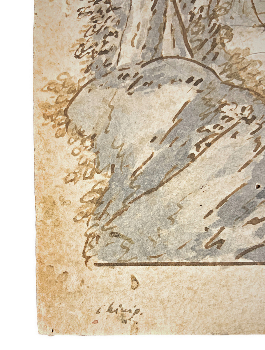 Gaspard Dughet, attr. (Roma 1615-1675). Disegno ad inchiostro bruno e inchiostro grigio su carta antica vergellata