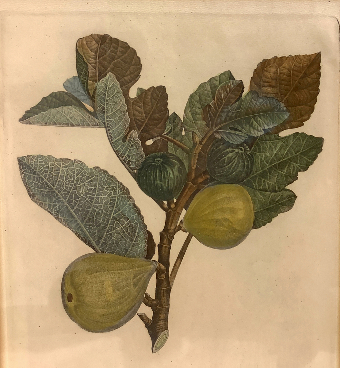 Incisione raffigurante ramo con fichi â€figue blanche rondeâ€, firmato Louise Bouquette 1765-1814. Cm 34x24,5 in corni