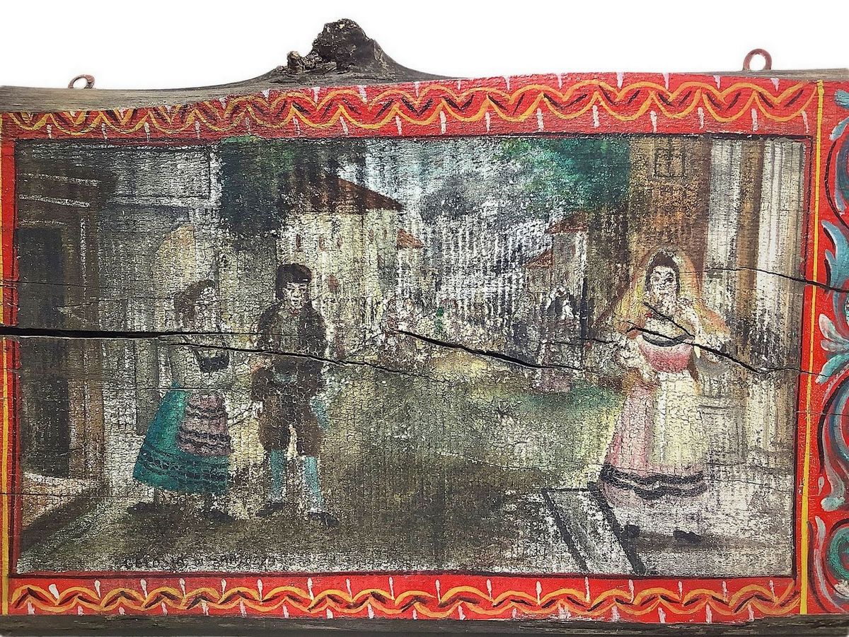 Tavola raffigurante scene della Cavalleria Rusticana, gelosia di Sara, Sicilia fine del XIX secolo, inizi XX secolo. Cm 39x67x6