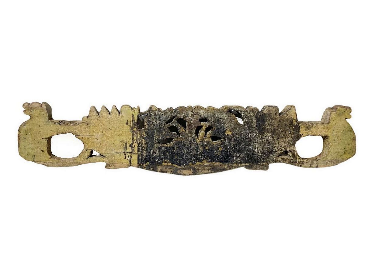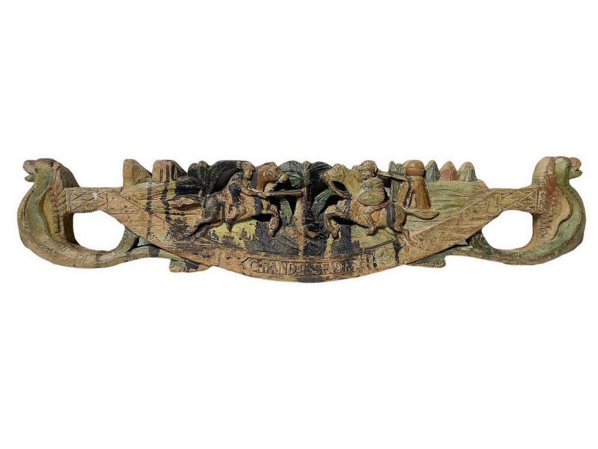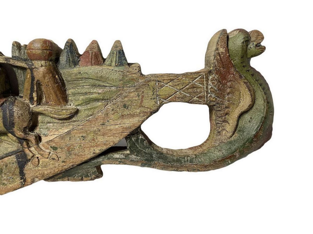 Scultura di chiave di carretto siciliano policroma, grande sfida, Sicilia, XIX secolo. Combattimento tra cavaliere cristiano e saraceno, Draghi alati ai terminali, cm 87x19