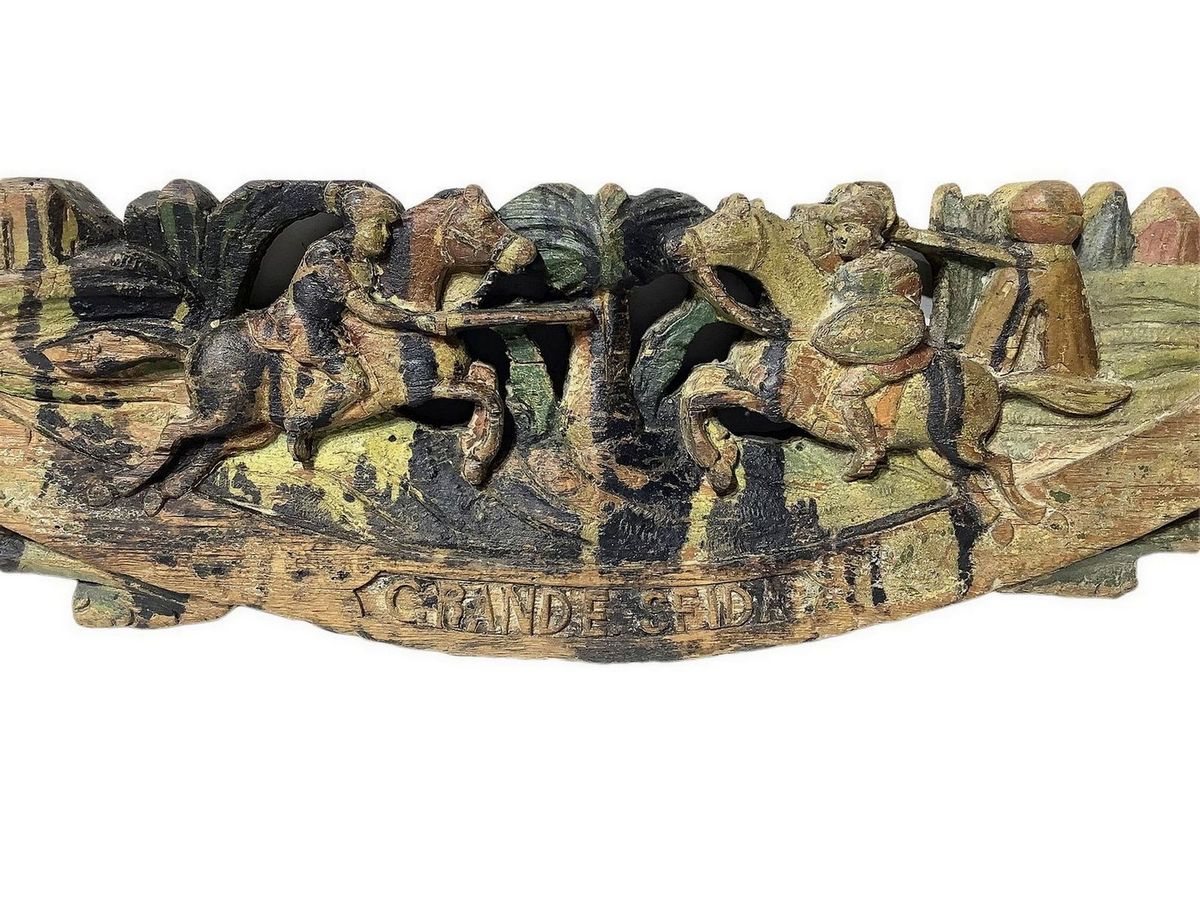Scultura di chiave di carretto siciliano policroma, grande sfida, Sicilia, XIX secolo. Combattimento tra cavaliere crist