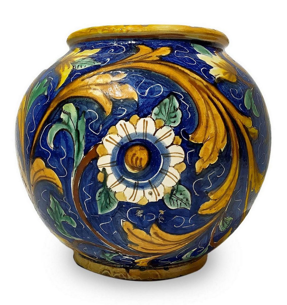 Boccia in ceramica di Caltagirone, Bottega Di Bartolo, inizi XX secolo. Decorazione floreale a foglie larghe nei modi de