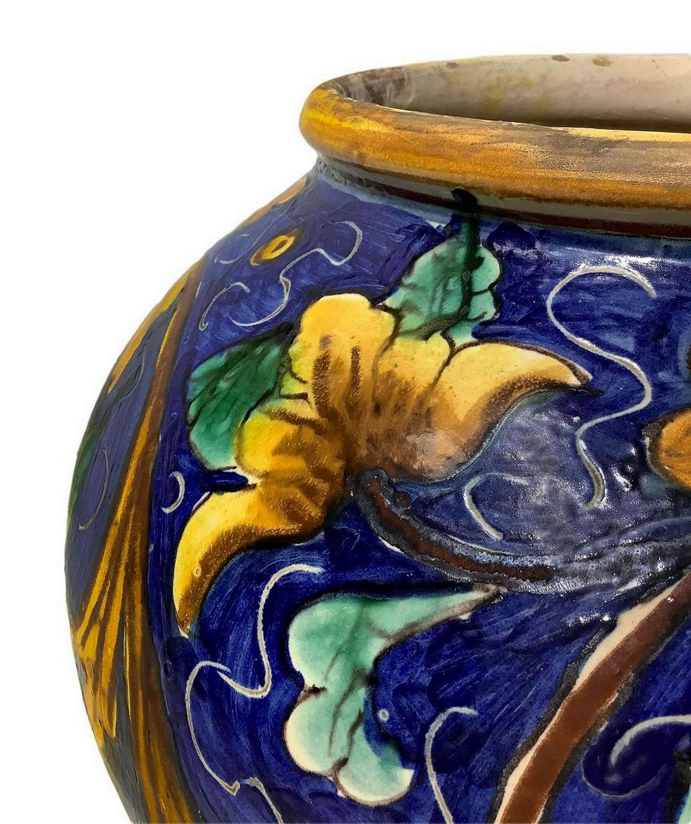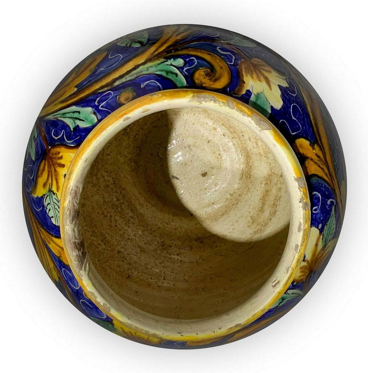 Boccia in ceramica di Caltagirone, Bottega Di Bartolo, inizi XX secolo. Decorazione floreale a foglie larghe nei modi del XIX secolo su fondo blu cobalto. H cm 36.