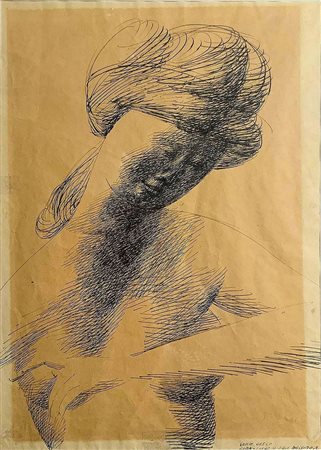 Emilio Greco (Catania, 1913-Roma,1995). Nudo di donna. 49x35, disegno a china su carta. Firmato a destra e siglato Roma. Sul retro altro disegno accennato e scritta : Largo di Villa Massimo 2 e data 1953. Etichette di mostre. "Il riconoscimento internazio