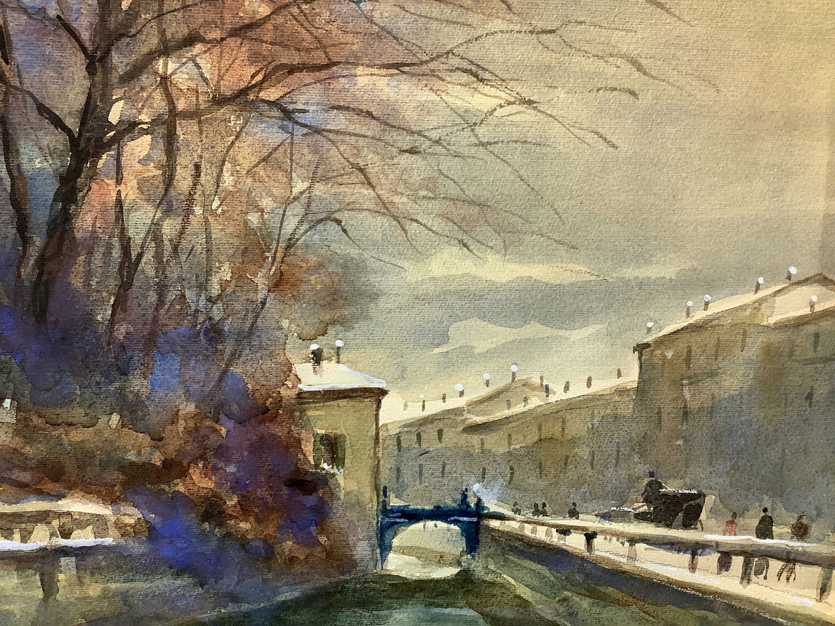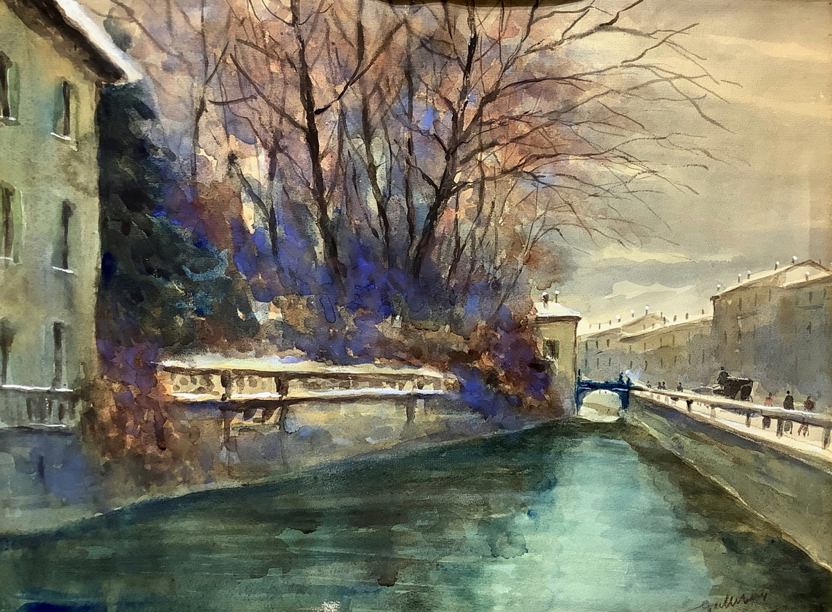 Dipinto ad acquerello su cartoncino raffigurante Lungarno, inizi XX secolo. Firmato in basso a destra. Cm 50x67, in corn