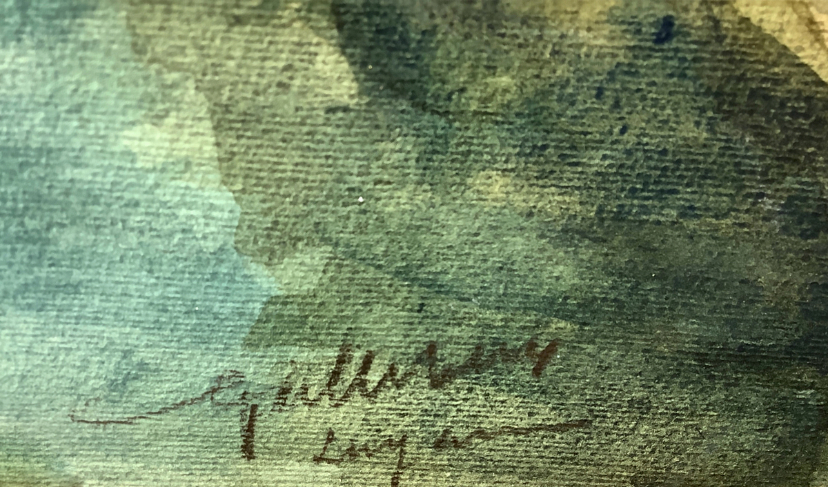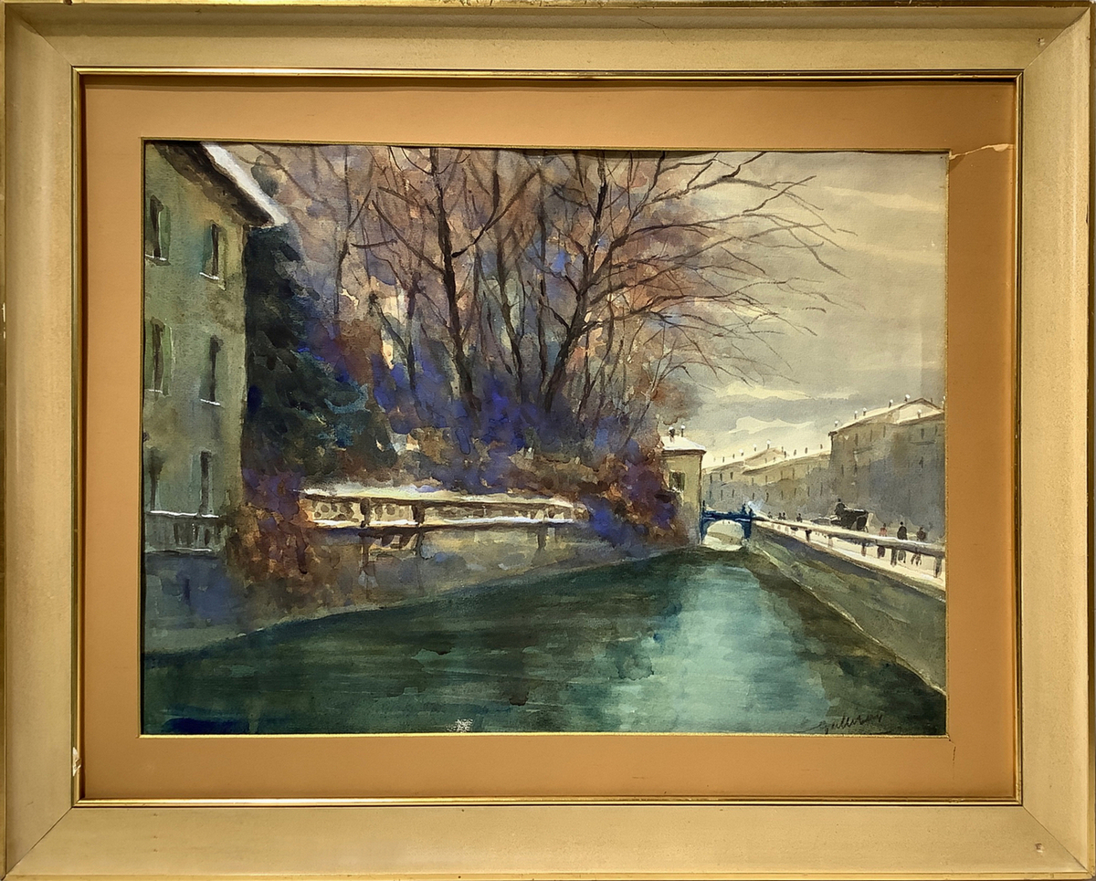 Dipinto ad acquerello su cartoncino raffigurante Lungarno, inizi XX secolo. Firmato in basso a destra. Cm 50x67, in cornice cm 70x87
