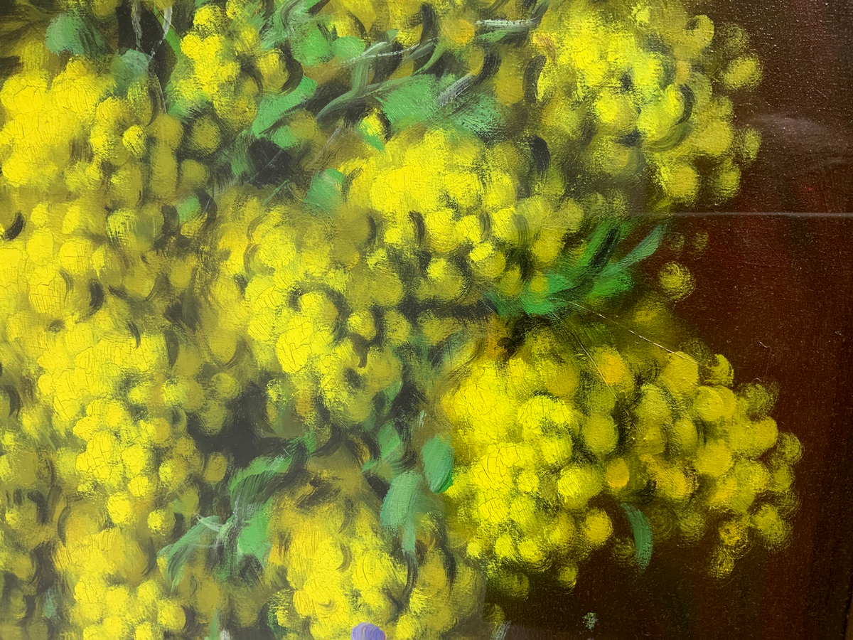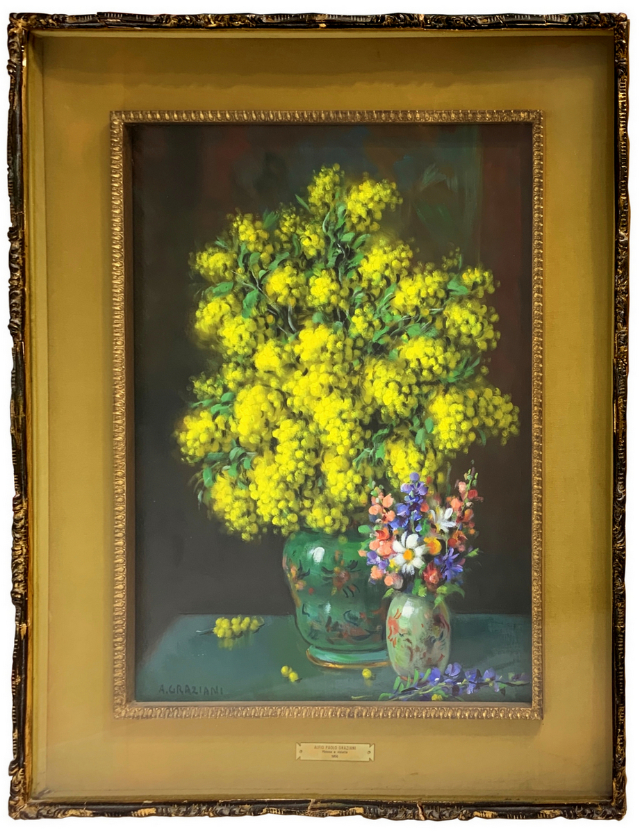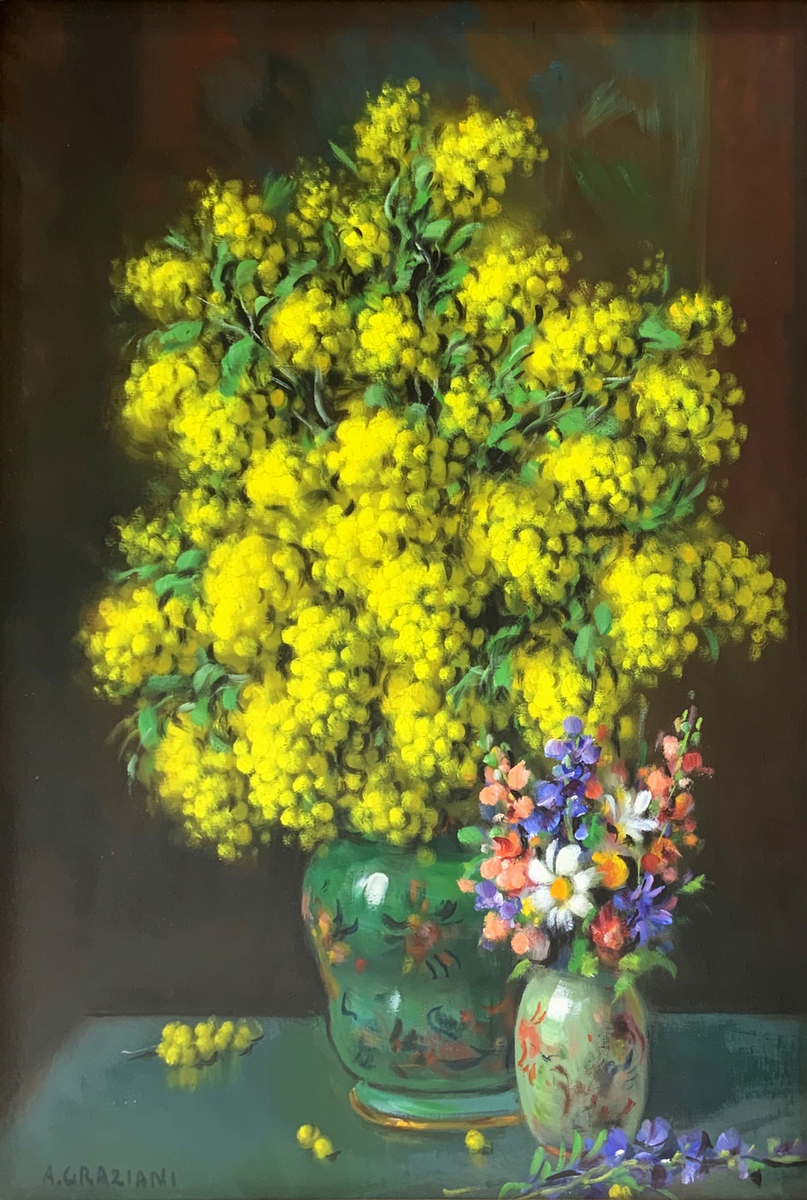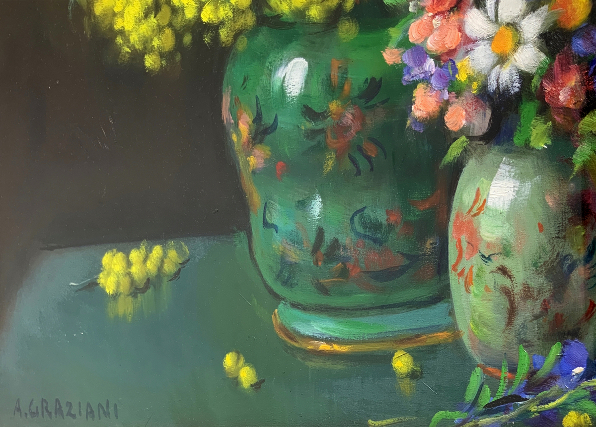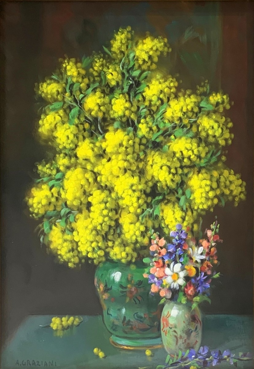 Dipinto ad olio su tela raffigurante “Mimose con violetteâ€, firmato in basso a sinistra A. Graziani. Alfio Paolo Gra