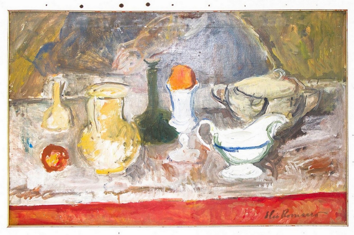 Dipinto ad olio su tela raffigurante natura morta con vasi, firmato in basso a destra Elio Romano (Trapani , 1909 - Catania, 1996). Cm 50x80