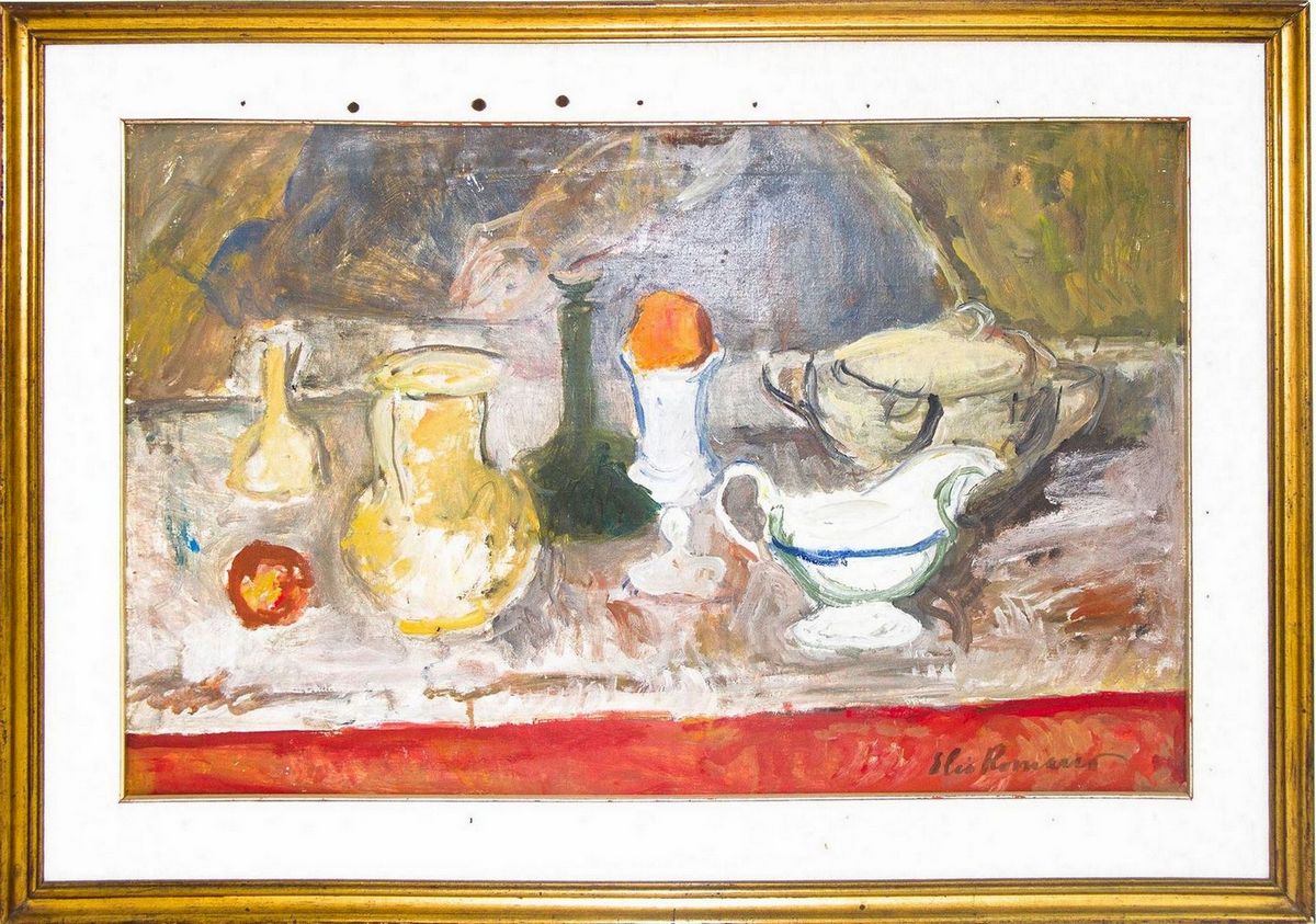 Dipinto ad olio su tela raffigurante natura morta con vasi, firmato in basso a destra Elio Romano (Trapani , 1909 - Cata