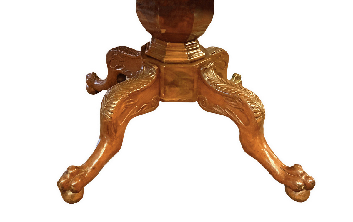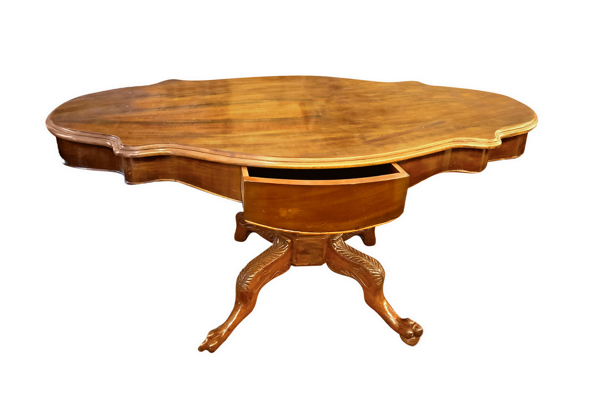 Tavolo a biscotto in legno di mogano con cassetti centrali ambo i lati, retto da una balaustra polilobata con piede a qu